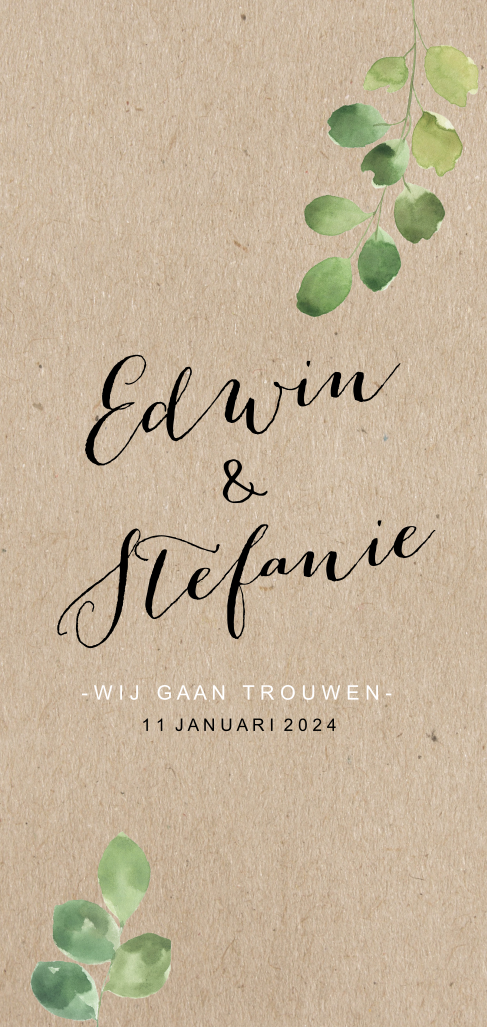Trendy trouwkaart met groene takjes op een kraftlook achtergrond. Bekijk ook onze bijpassende save the date kaart en bedankkaart.