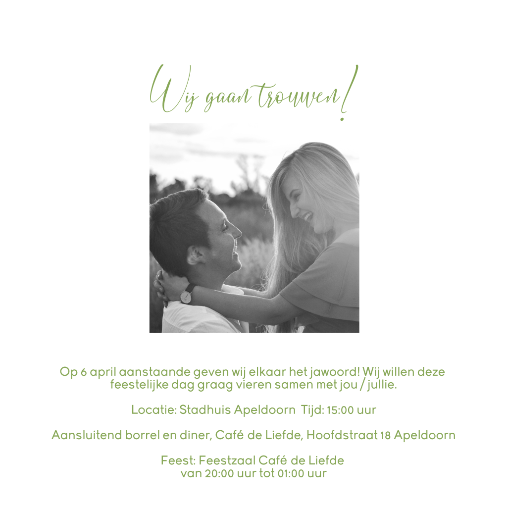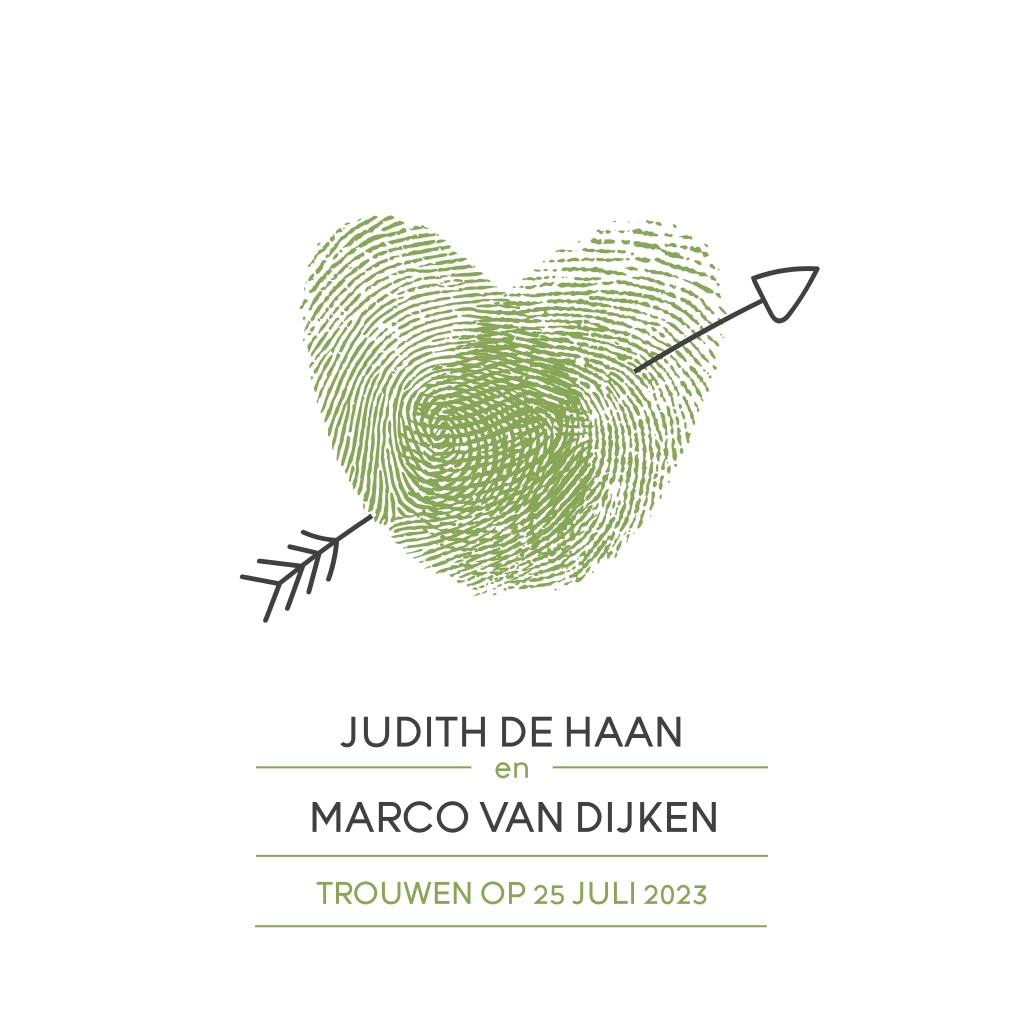 Stijlvolle uitnodiging die je naar je bruiloft gasten kunt sturen, met een groot hart van twee groene vingerafdrukken met een pijl erdoor heen. Aan de binnenkant van de kaart is ruimte om je eigen foto te plaatsen.