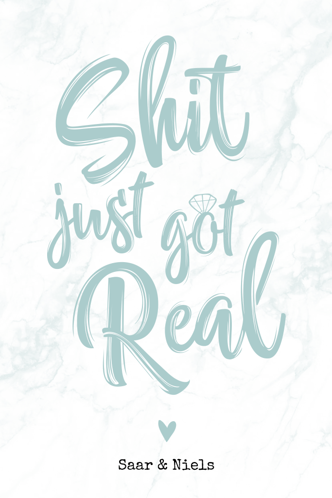 "Shit Just Got Real!" Uitnodiging bruiloft met stoere en hippe tekst in mintgroene typografie op een groene marmer-look achtergrond. Liever een andere kleur? Pas het eenvoudig aan in de editor!