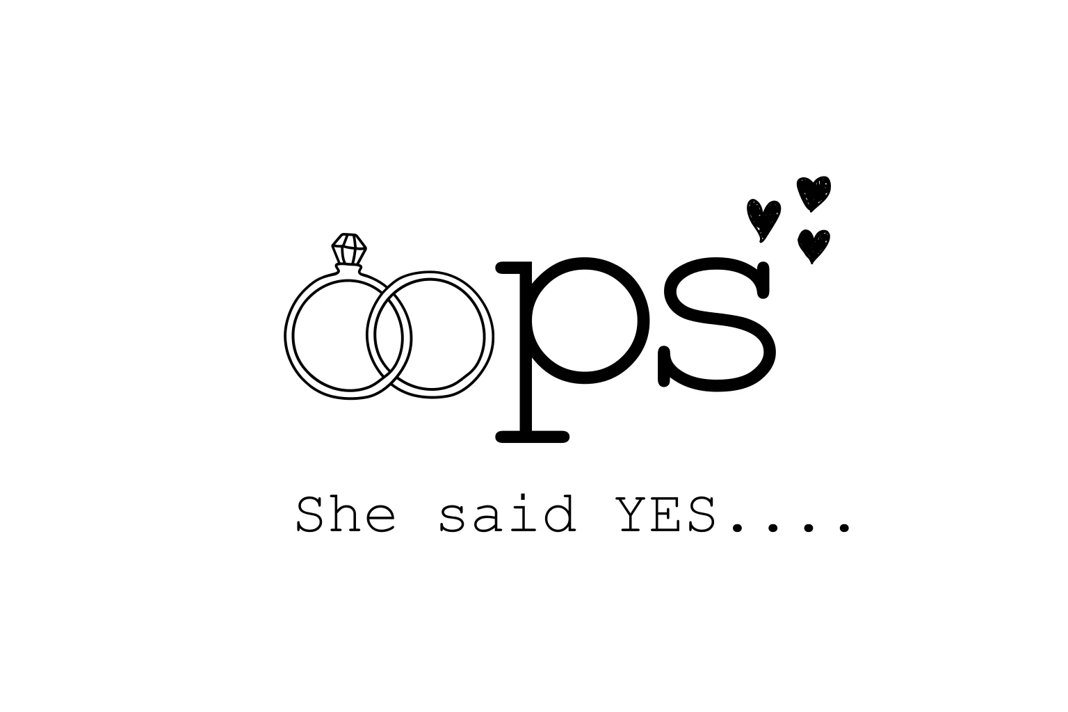 Humoristische trouwkaart met tekst OOPS geschreven met twee trouwringen. Er staan kleine zwarte hartjes en daaronder de tekst she said yes. Pas de tekst en de kleur aan in de online editor.