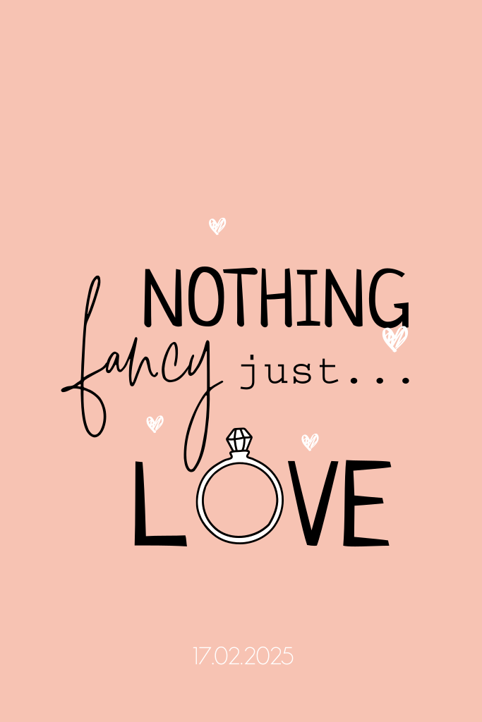 Hippe trouwkaart in het roze met witte hartjes. In het zwart staat de tekst in verschillende lettertypes. Het woord Love staat geschreven met een trouwring als de letter O. Pas de tekst en kleur aan in de online editor.