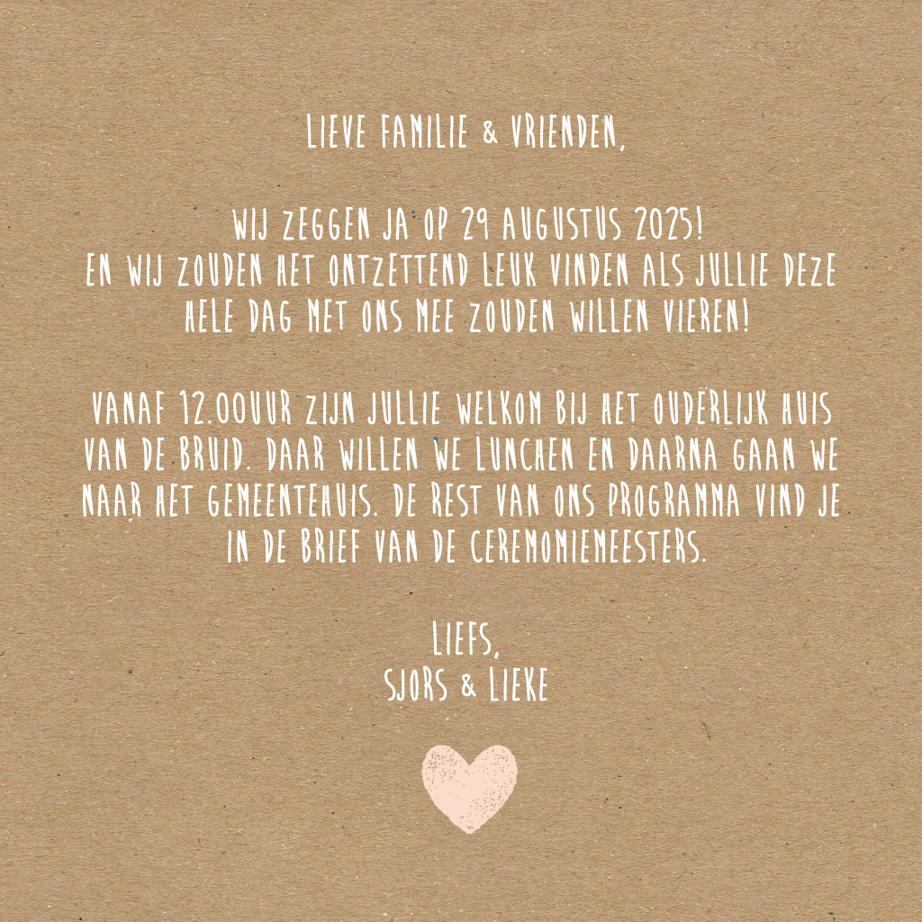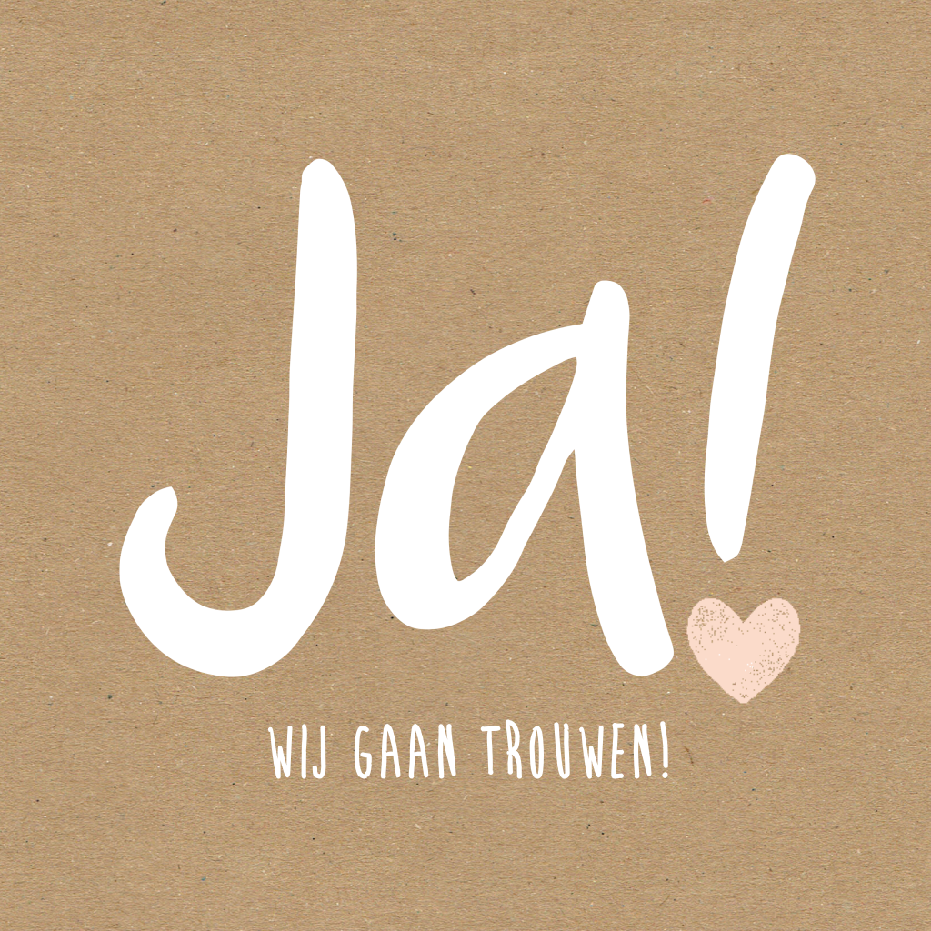 Deze trouwkaart met kraft achtergrond en in het groot JA voorop kun je aanpassen naar smaak en wens. Door de kraft achtergrond heeft deze kaart een stoere uitstraling.