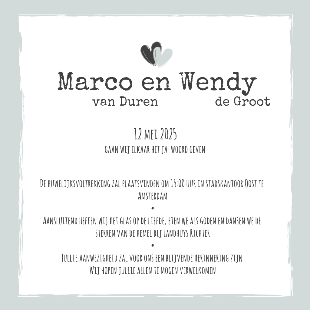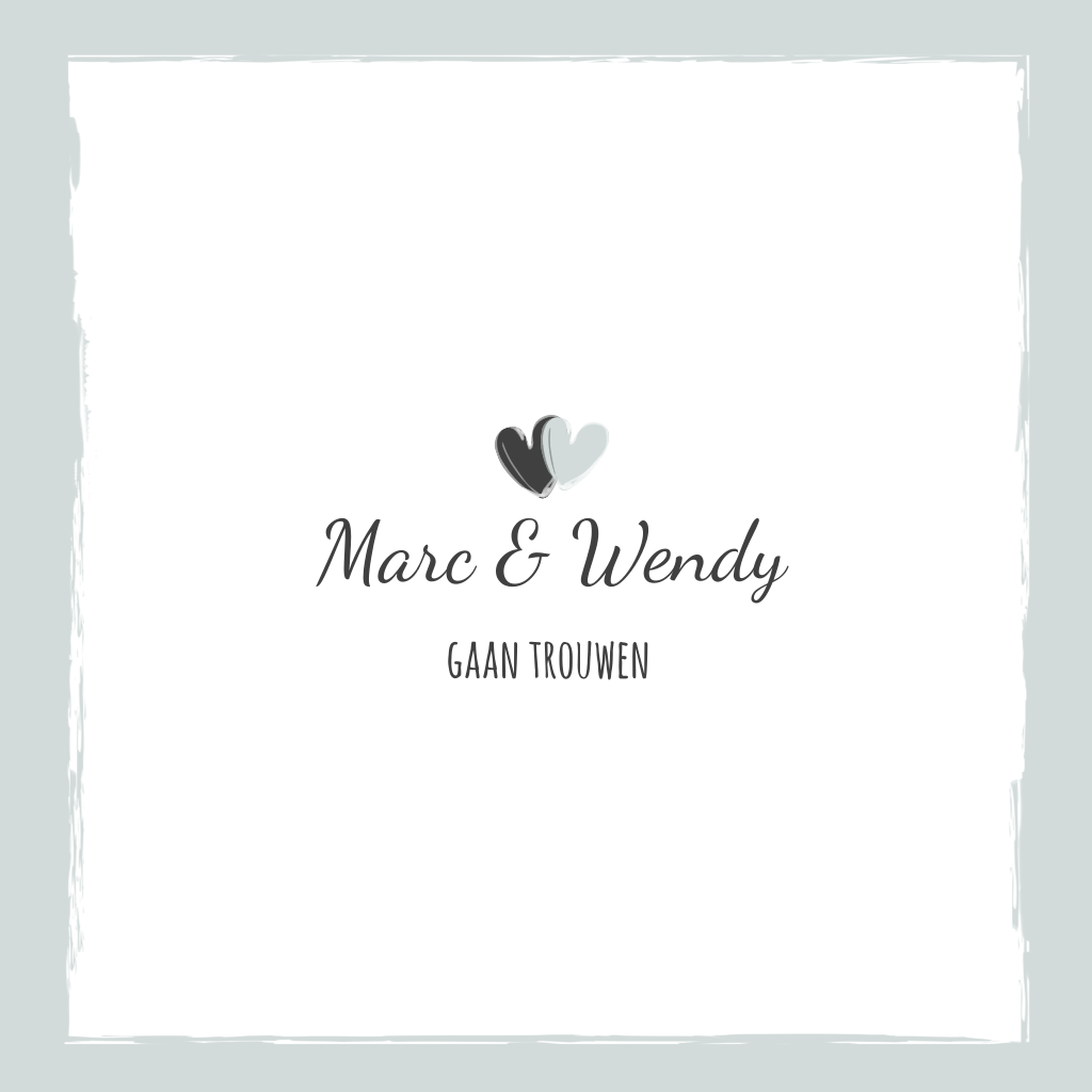 Een hippe trouwkaart met een grijs kader en twee lieve hartjes. Het kader kun je ook naar wens omkleuren! Aan de binnenkant is ruimte voor eigen teksten en eventueel een gedichtje. Tip: kies een envelop in dezelfde kleur als de rand van de kaart!