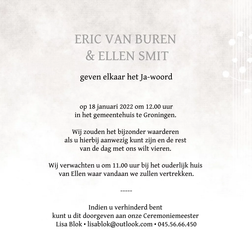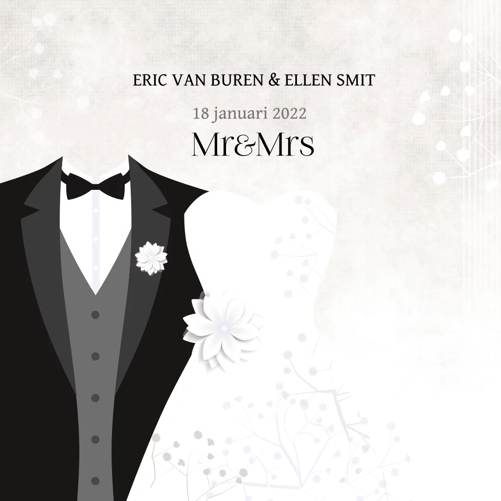 Heb jij al een trouwjurk gekozen? En is het pak al binnen? Dit klassieke kaartje is gepimpt met een outfit voor hem en voor haar. De gemêleerde achtergrond heeft een rustige kleur en is versiert met subtiele lijnen en stippen. Aan de binnenkant is ruimte voor jullie eigen tekst. Voor Mr and Mrs ...?!