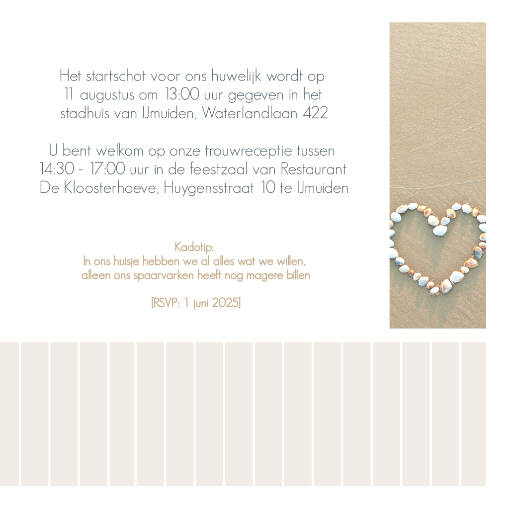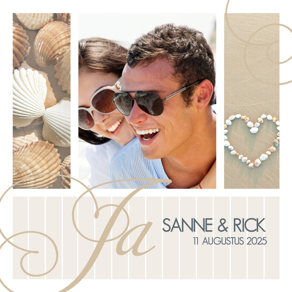 Ja, jullie gaan trouwen! Misschien is deze klassieke trouwkaart in strandthema iets voor jullie. De verschillende blokken met foto's en patronen maken dit een compleet kaartje. Voeg een leuke foto toe van jullie samen en dit kaartje is helemaal af!