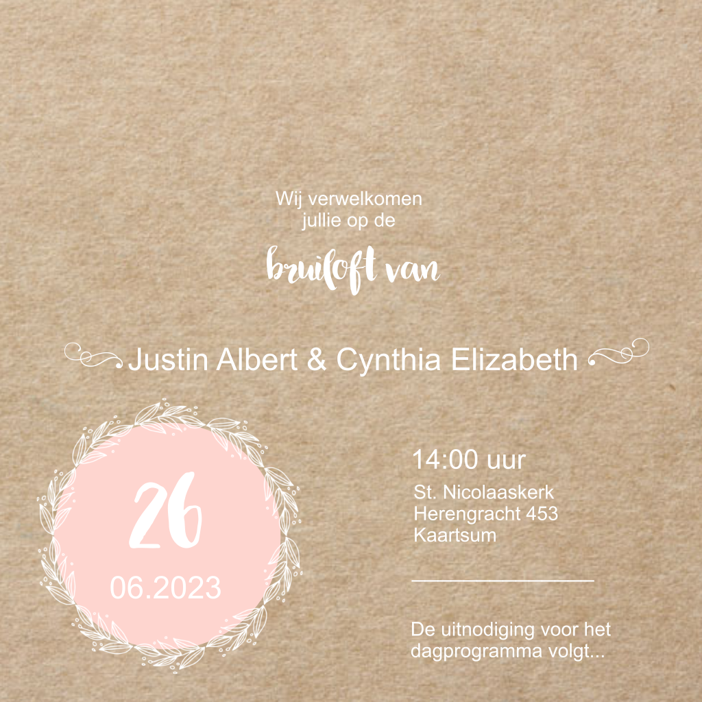 Romantische trouwkaart met roze bloemen op een kraftachtergrond. Ook tof is het roze rondje voor de trouwdatum. Fijne bruiloft!