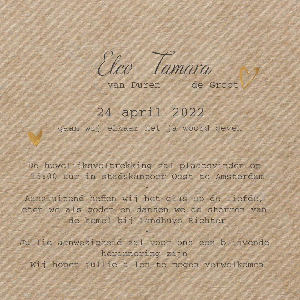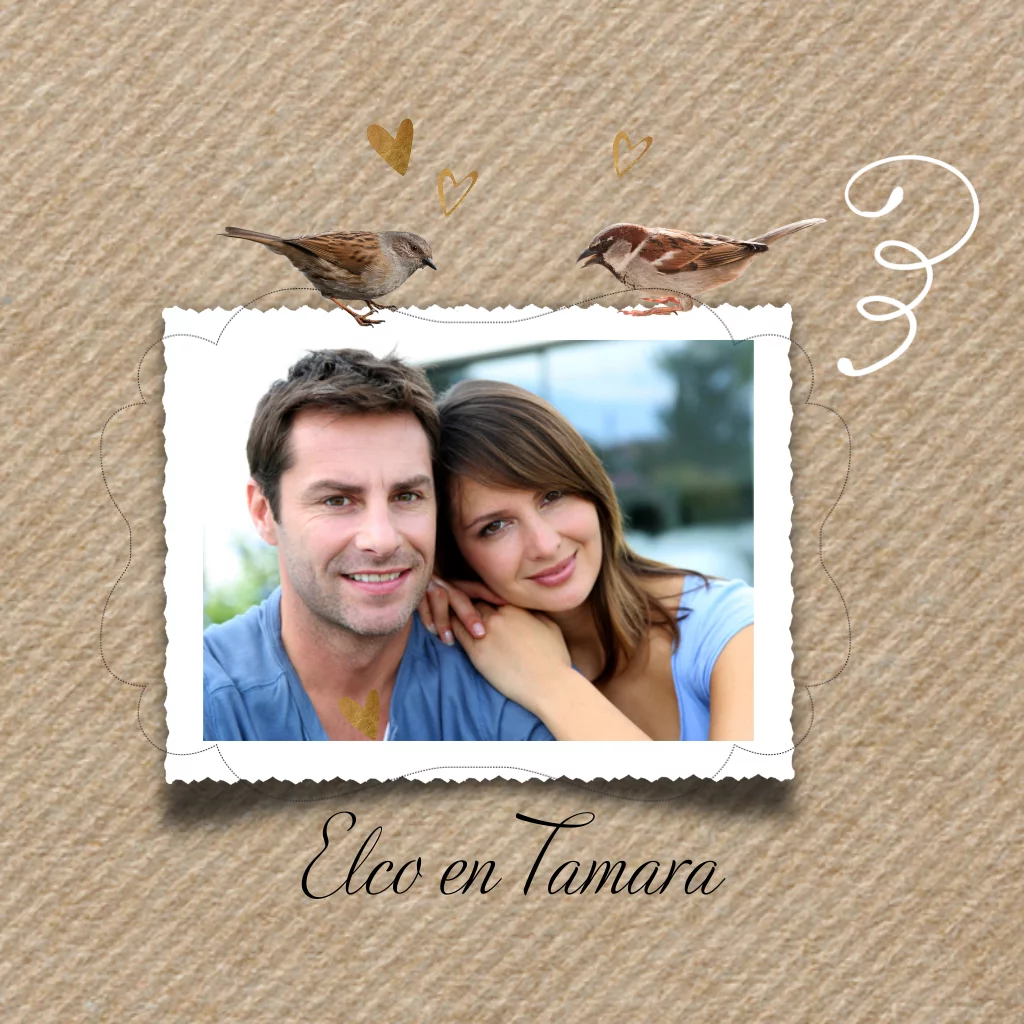 Een trouwkaart van ribbelkarton, met een foto en twee vogeltjes met een hartje: wat origineel! Deze trouwkaart heeft een natuurlijke look. Iets voor jullie?