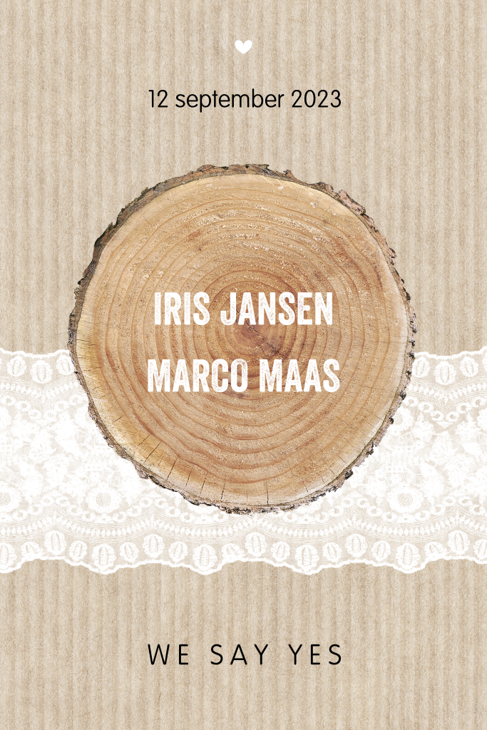 Stoer trouwkaartje van kraftkarton met een doorsnede van een boomstam waarin je de namen kunt zetten. Ook tof is het witte kantpatroon en het kleine, witte hartje! Maak jij dit originele kaartje af? Tip: mooi op Oud-Hollands papier!