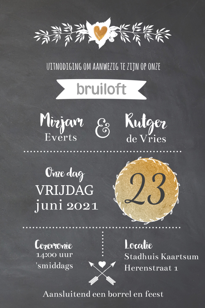 Een illustratie van witte takjes, een tekstbanner, pijltjes, hartjes, verschillende hippe lettertypes: supertrendy! Een unieke trouwkaart in krijtbord-stijl.