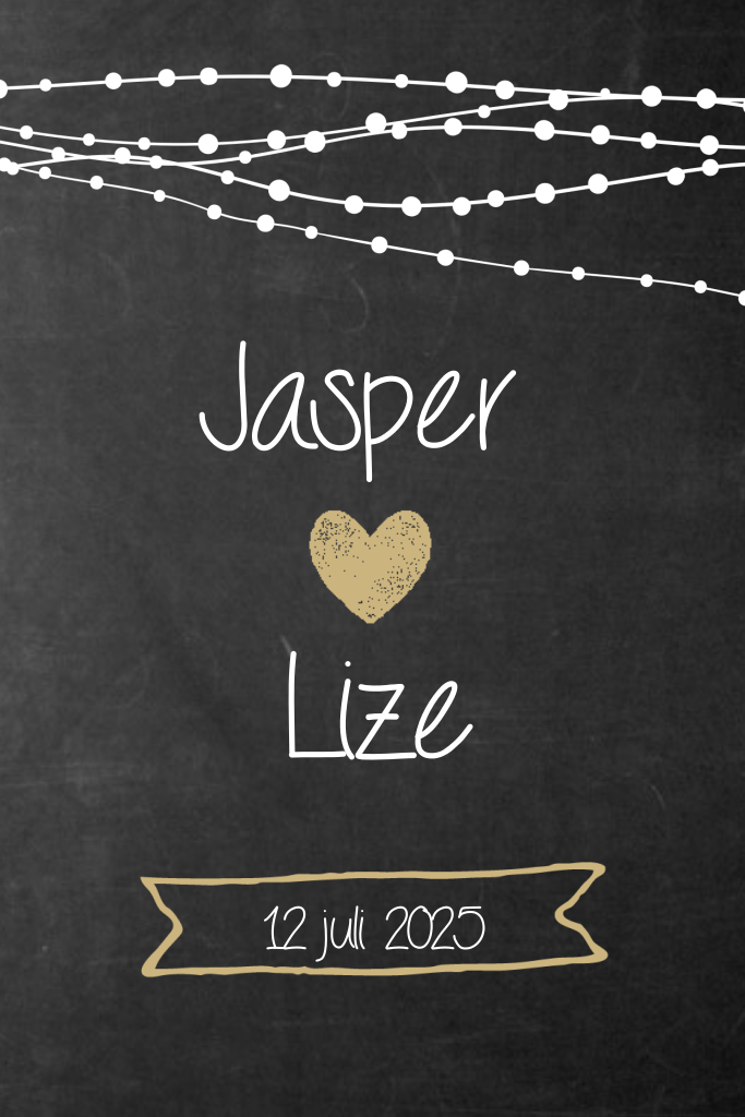 Wat een stoere en feestelijke trouwkaart! Deze kaart met lampjes slinger en goudkleurige attributen en krijtbord achtergrond kun je zelf aanpassen naar smaak.