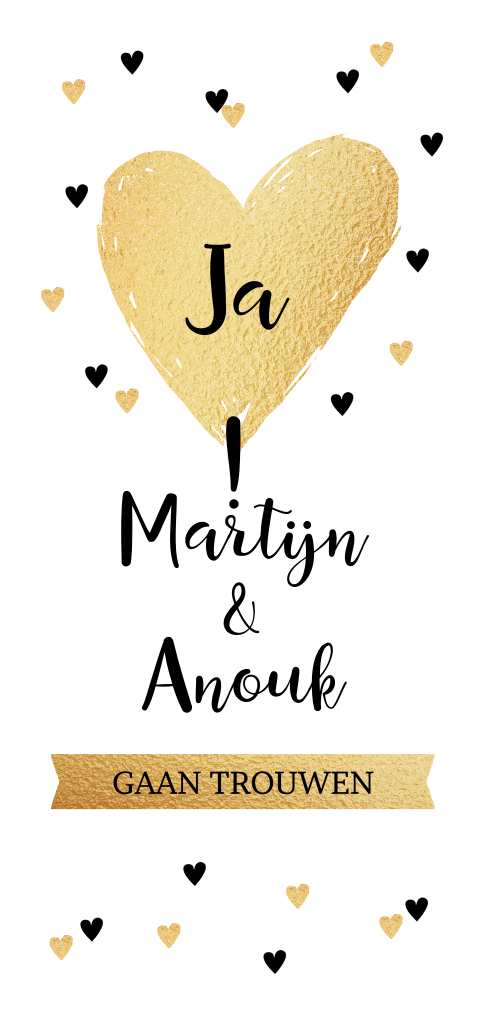 Een hippe, langwerpige trouwkaart met vrolijke hartjes in goudlook! Speciaal is ook de goudkleurige button en het mooie hart met 'Ja!'. De zwarte en witte onderdelen kun je eventueel van kleur veranderen. Tip: Deze kaart heeft een bijpassende save the date kaart en en een menukaart!