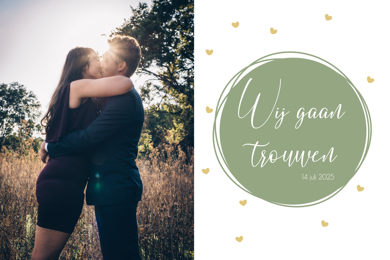 Romantische uitnodiging voor jullie trouwdag met lieve hartjes en olijfgroene details. Zet een mooie foto van jullie verloving op de voorkant en verstuur deze kaart!