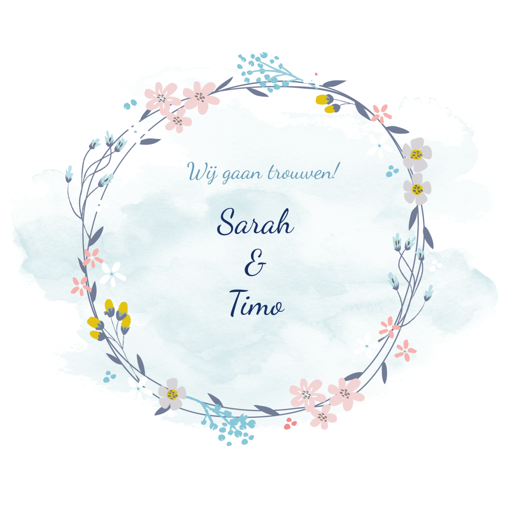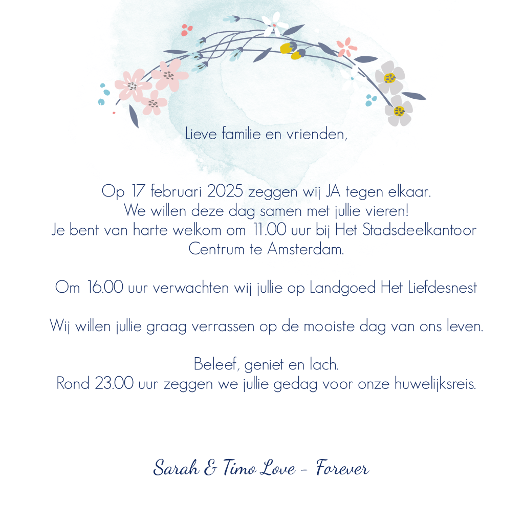 Lief trouwkaartje met bloemenkrans met prachtig geschilderde bloemetjes. De krans staat op een watercolour wolk. Ook aan de binnenkant is de krans te bewonderen. In het midden zet jij de uitnodiging voor je gasten.