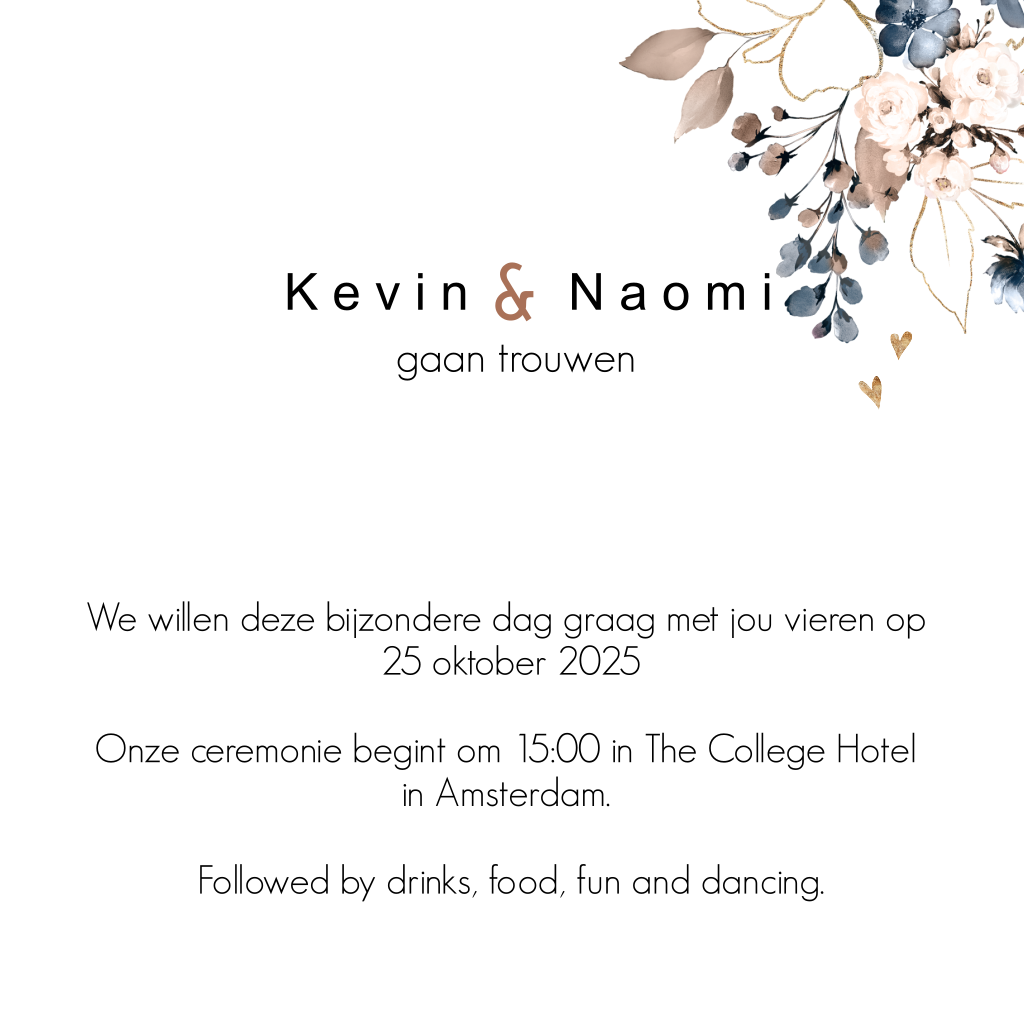 Een moderne trouwkaart met een strak lettertype en een bloemenboeket in goudkleur, donkerblauw, lichtroze en bruin. Chique en vrolijk tegelijkertijd! Wanneer is jullie trouwerij?