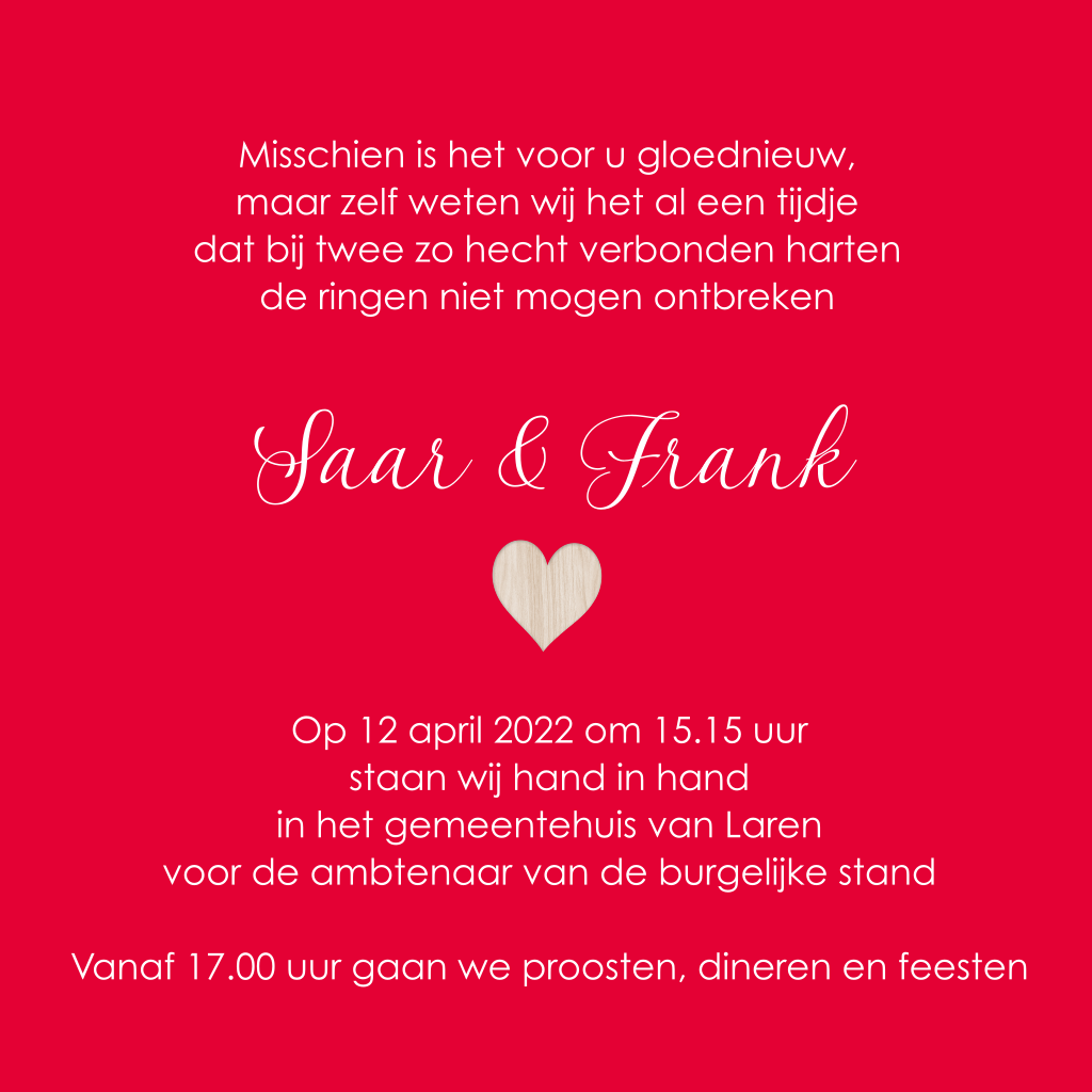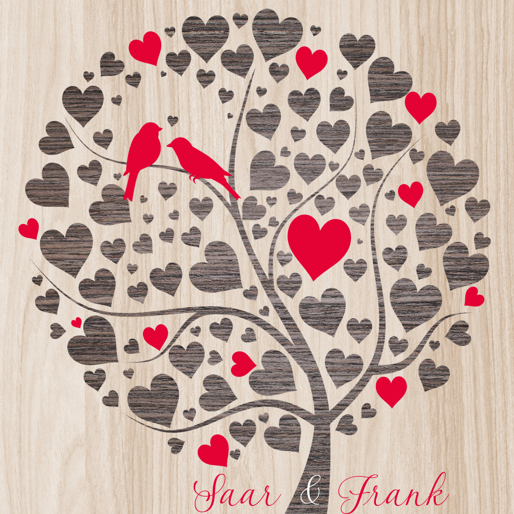 Dit hippe trouwkaartje heeft een lichte houtachtergrond en een silhouet van een hartjesboom met twee vogels. De rode elementen maken dit kaartje helemaal af!