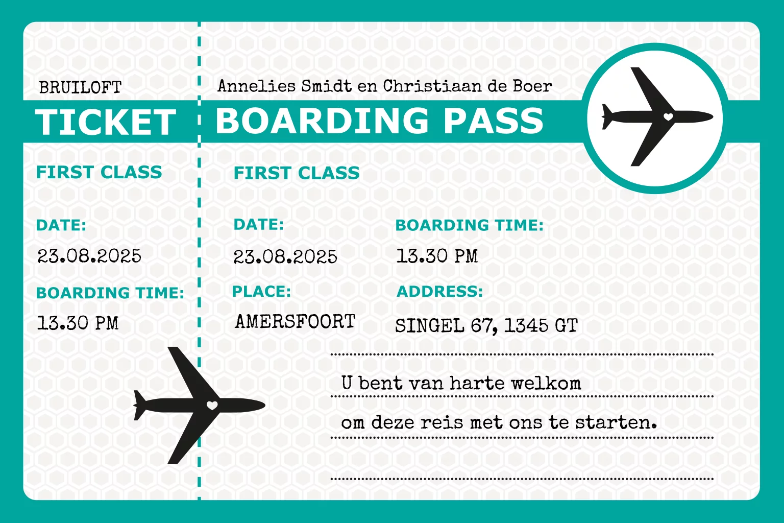 Met wie start jij de reis van het huwelijk? Deze trouwkaart in de stijl van een boarding pass is super origineel! Met illustraties van vliegtuigen en alle relevante informatie voor gasten op een rijtje.