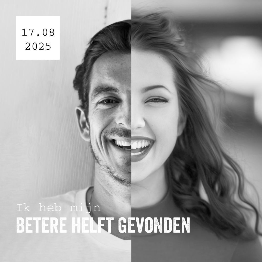 Humoristische foto trouwkaart in het zwart wit. Op de voorkant staan twee gezichten die samen één gezicht vormen. In het wit de tekst, ik heb mijn betere helft gevonden. Plaats eenvoudig je eigen foto en personaliseer de tekst in de online editor.