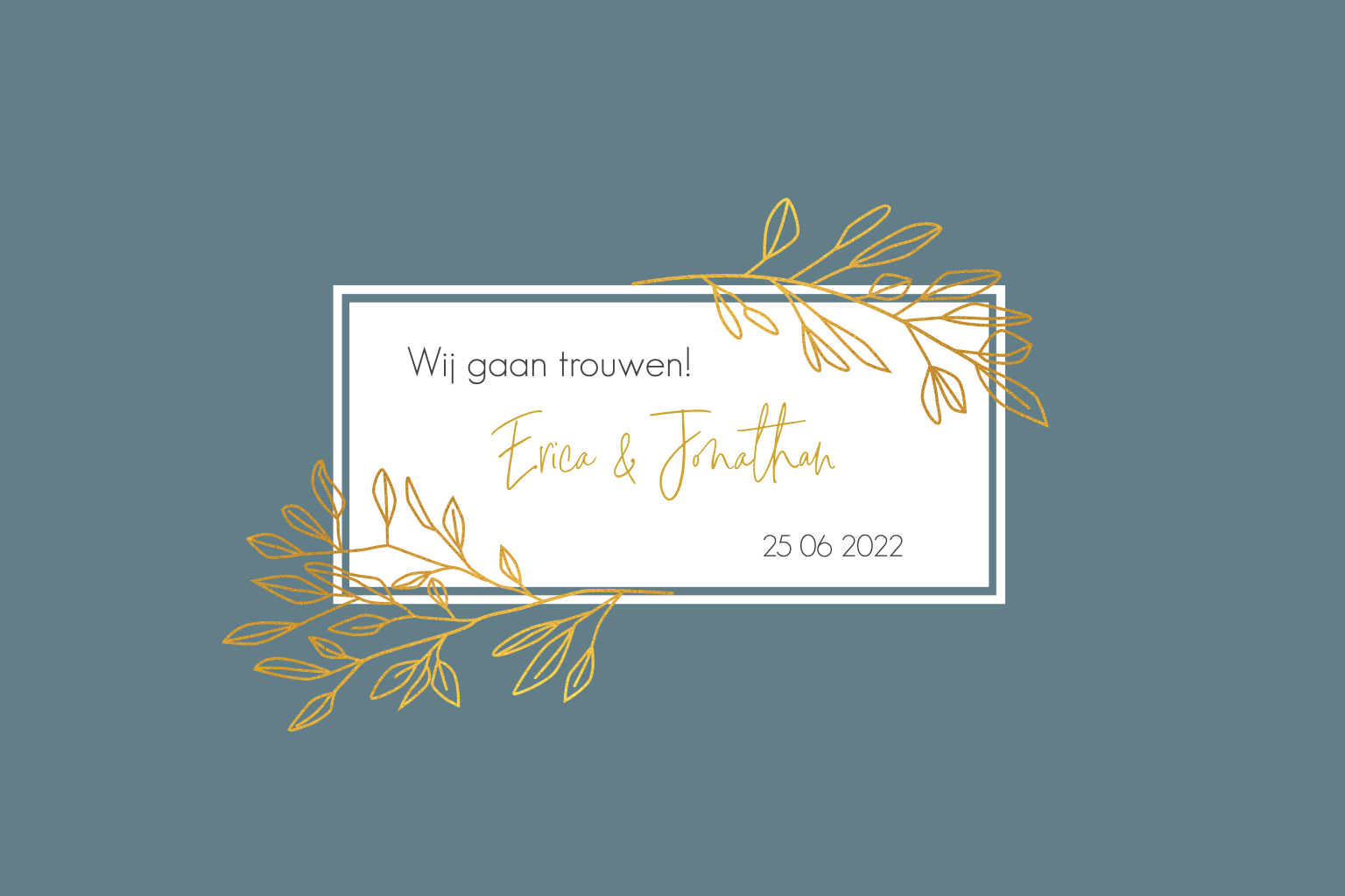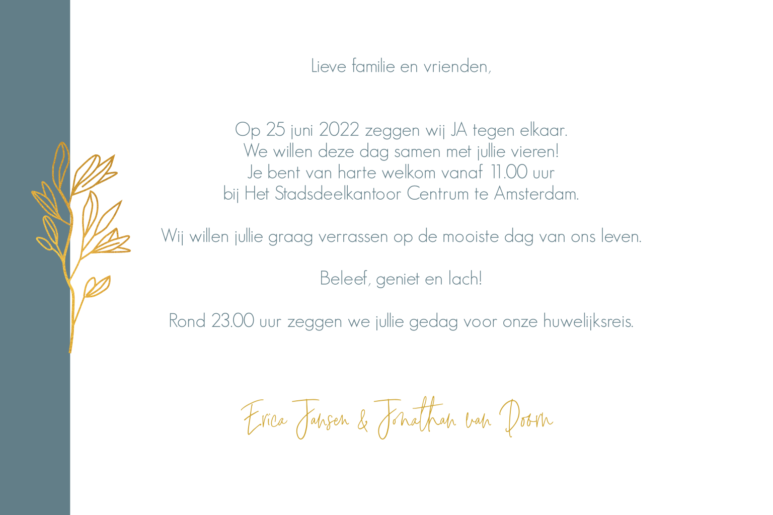 Een stijlvolle en moderne trouwkaart in petrol met een tekstvlak en getekende takjes in de hippe kleur okergeel. Nodig vrienden en familie uit voor jullie bruiloft!