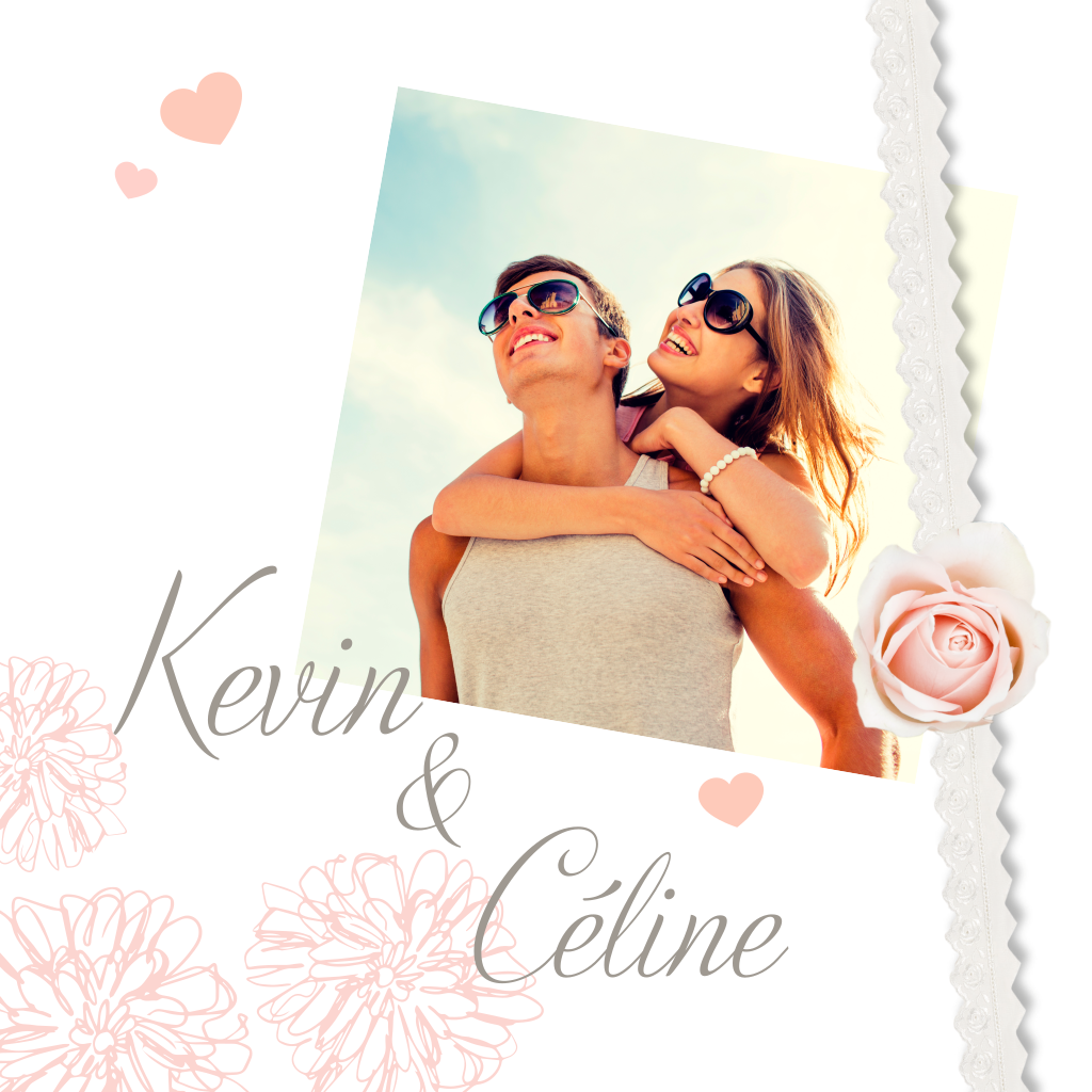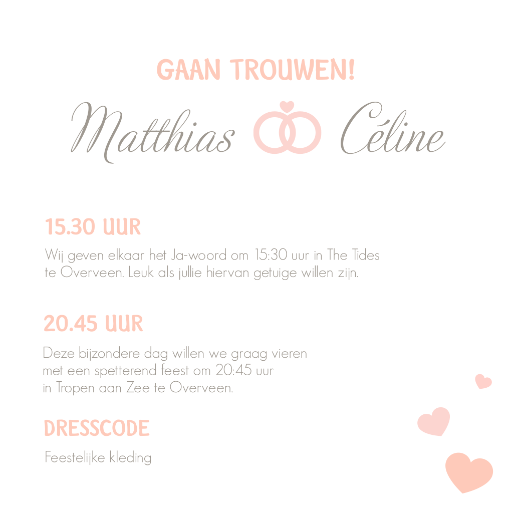 Gaan jullie binnenkort trouwen? Gefeliciteerd met deze mooie stap! Stuur deze mooie romantische uitnodiging voor jullie trouwdag naar je vrienden en familie en nodig ze uit voor jullie bruiloft! Met peach kleurige bloemetjes, lintjes, hartjes en een foto op de voorkant.