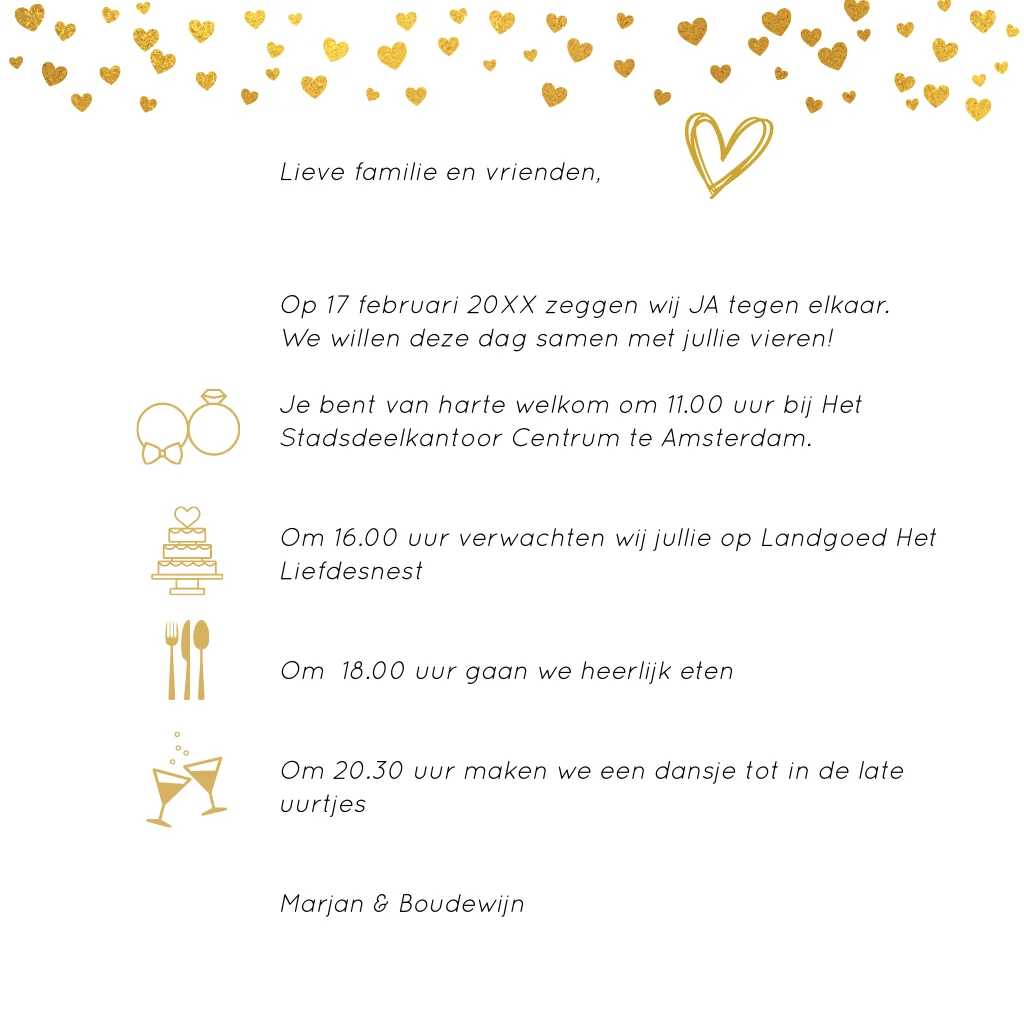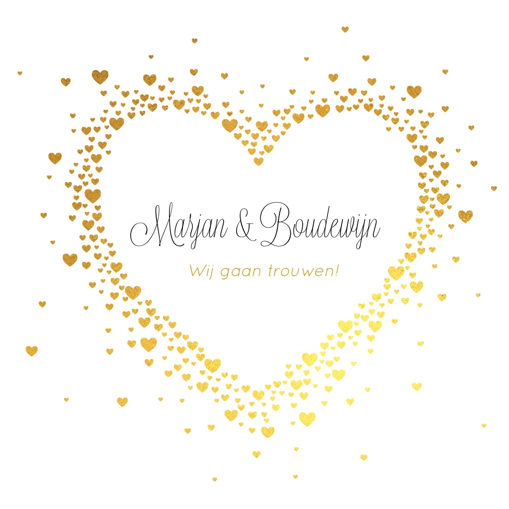 De liefde spat van deze trouwkaart af! Van allemaal kleine, goudkleurige hartjes wordt één groot hart gevormd met jullie namen erin. Maak deze hippe, romantische trouwkaart compleet met een bijpassende envelop en sluitzegel in goud. Tip: Deze kaart heeft een bijpassende save the date kaart en een menukaart!