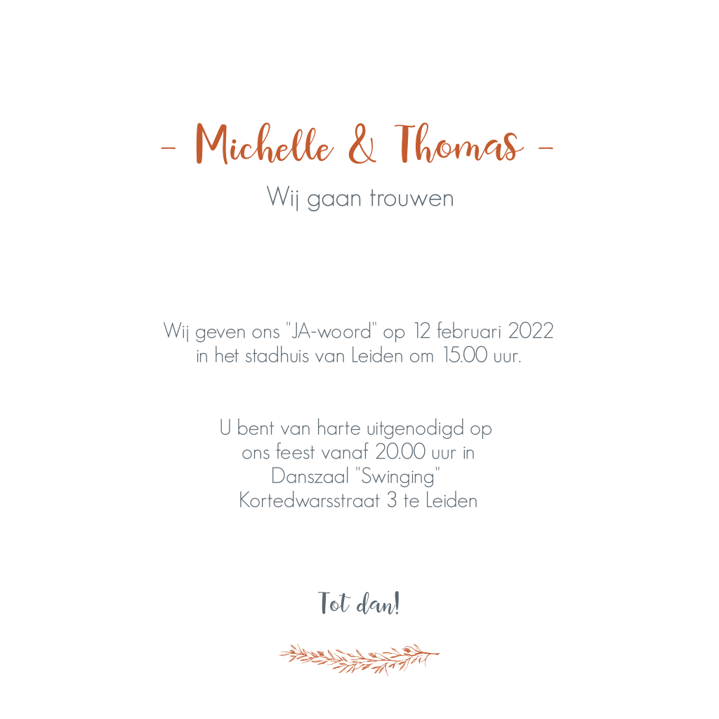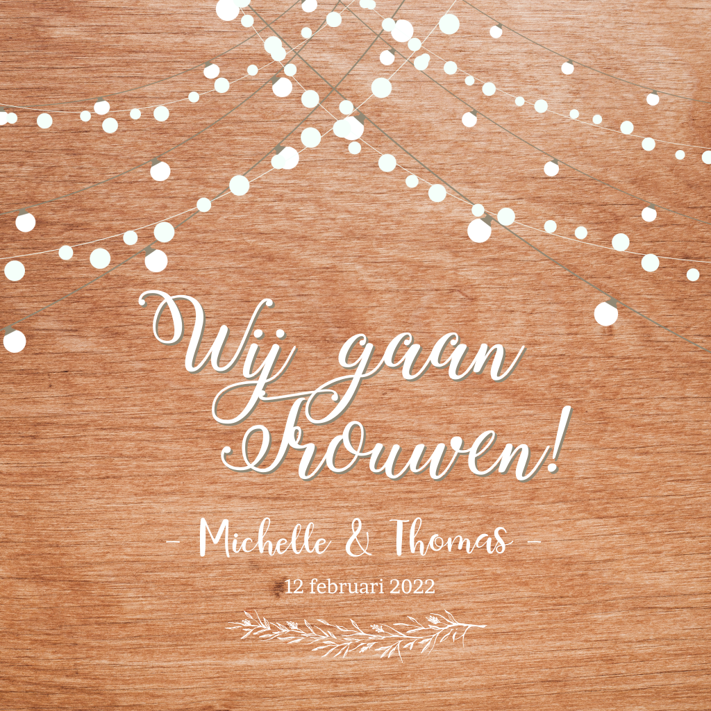 Een houtachtergrond met lampjesslingers: wat een romantische trouwkaart! Leuk zijn de sierlijke takjes die aan de binnenkant ook weer terugkomen. Deze kaart heeft zowel een feestelijke als een natuurlijke look.
