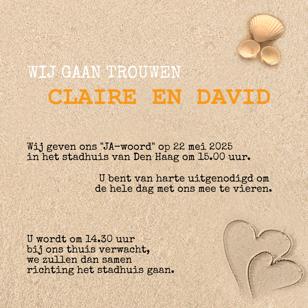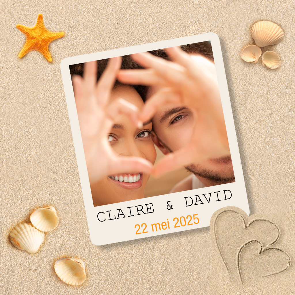 Welke foto komt er in dit polaroidframe te staan? Deze romantische trouwkaart is helemaal trendy en in strandthema. De ster, schelpen en zandtekeningen van hartjes maken dit kaartje helemaal af. Voeg je eigen teksten toe en maak er helemaal je eigen trouwkaart van!