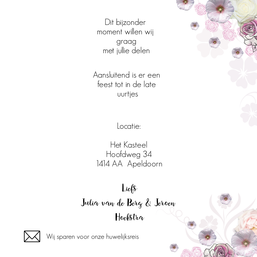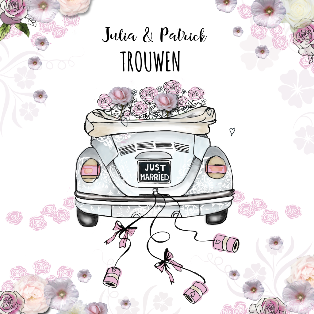 Uitnodiging voor jullie bruiloft met een oude volkswagen kever waar aan de achterkant allemaal blikjes aan hangen en romantische bloemen. Pas in de online editor eenvoudig de lettertype aan en schrijf je eigen teksten en maak zo deze kaart af!