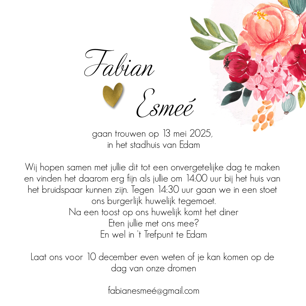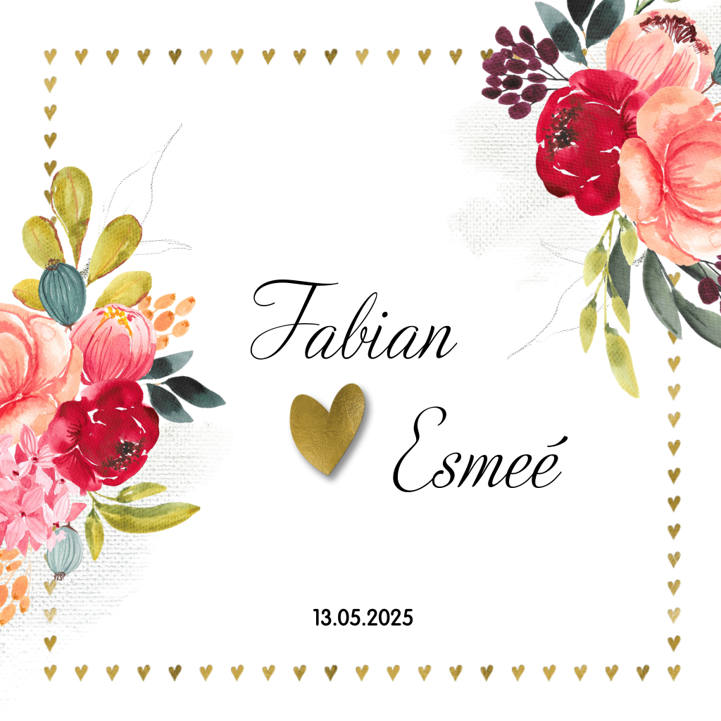 Deze stijlvolle trouwkaart met rozen heeft een romantische uitstraling in combinatie met de hartjesrand en het goudkleurige hart in het midden. Het sierlijke lettertype combineert hier mooi bij. Wanneer is jullie bruiloft?