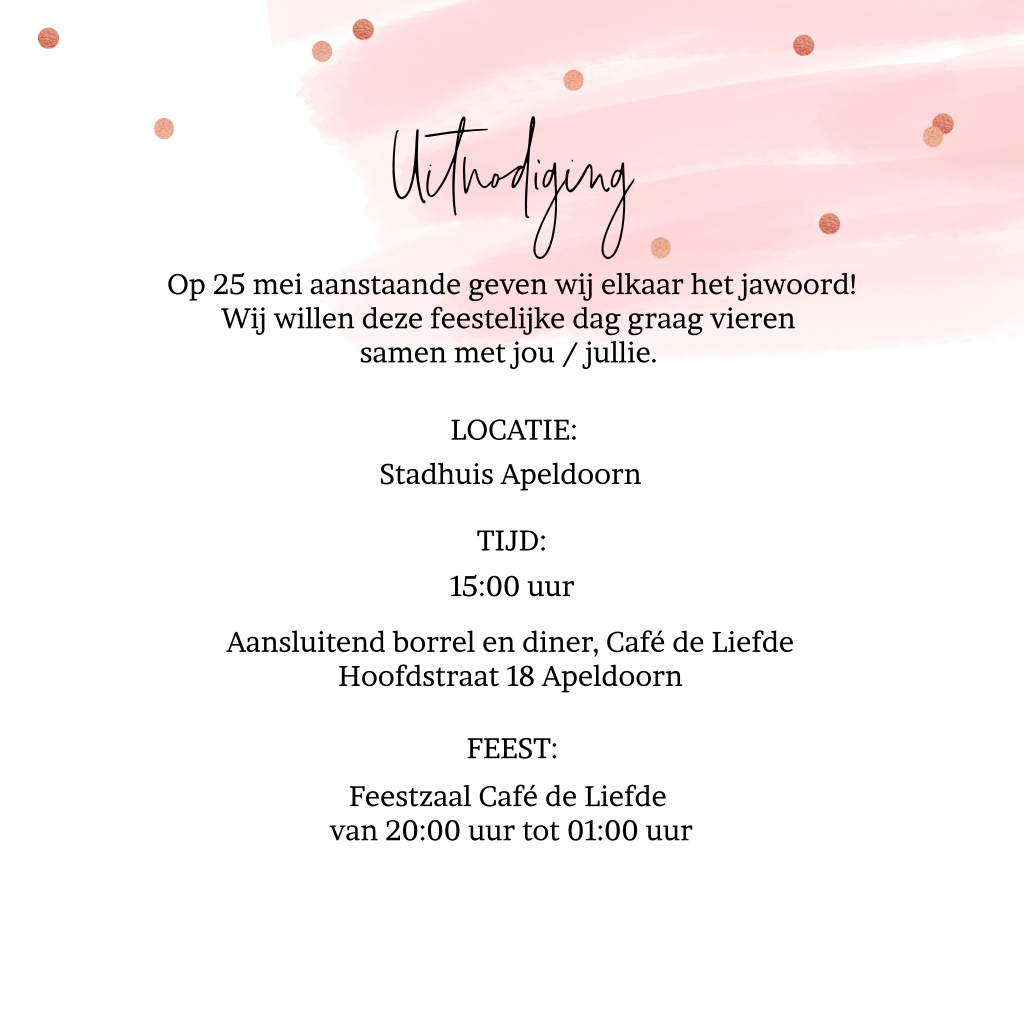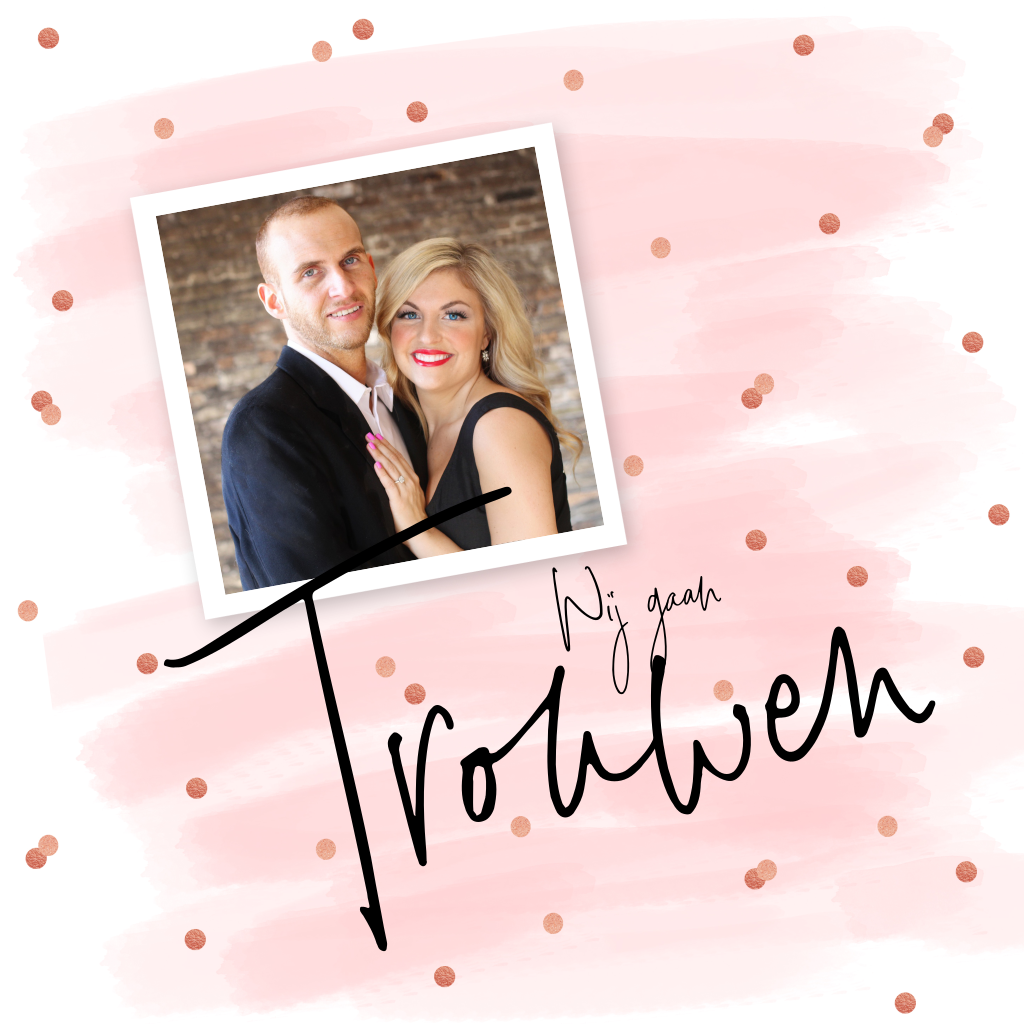 Een stijlvolle trouwkaart met foto, koperkleurige confetti en mooie tekst. Vervang zelf de foto en pas de teksten aan.