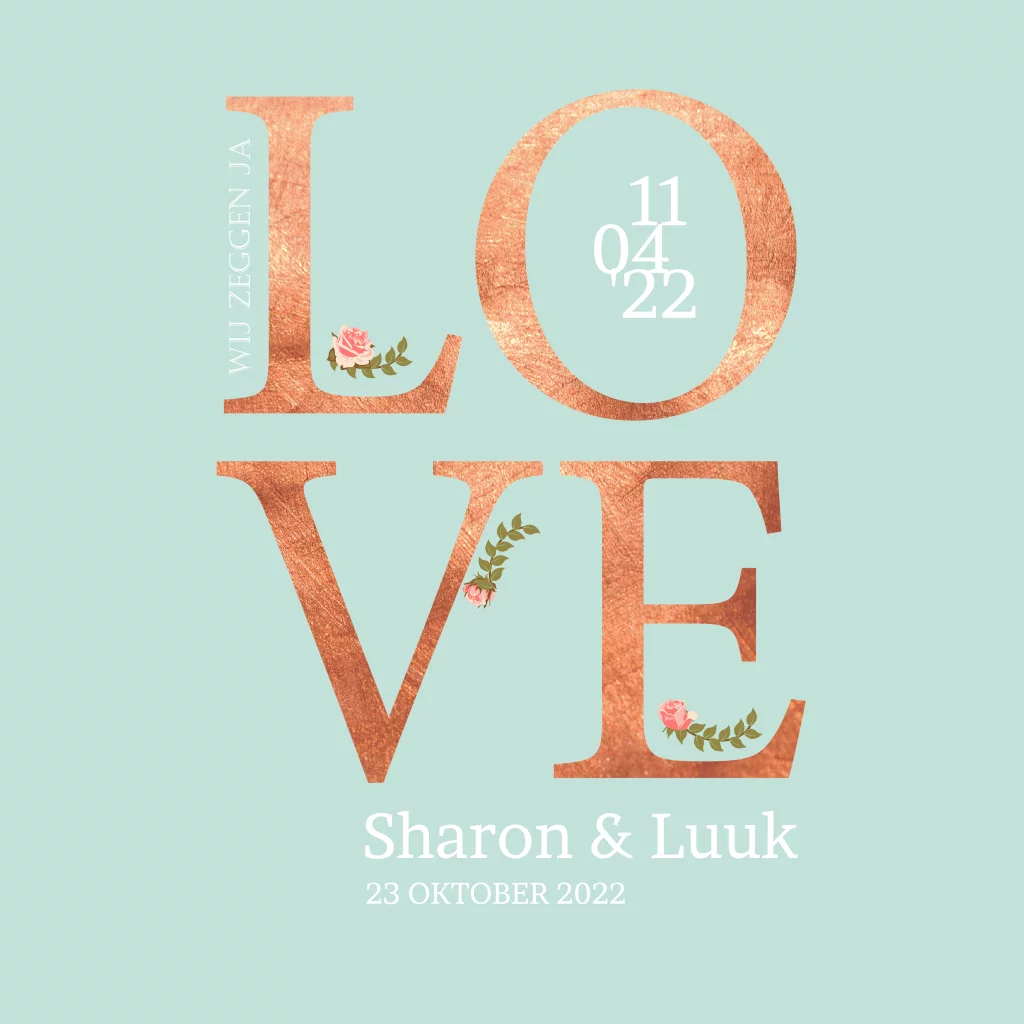 Deze stijlvolle trouwkaart combineert de hippe, goudkleurige letters LOVE met een mintgroene achtergrond. De roze roosjes maken deze combinatie helemaal af!