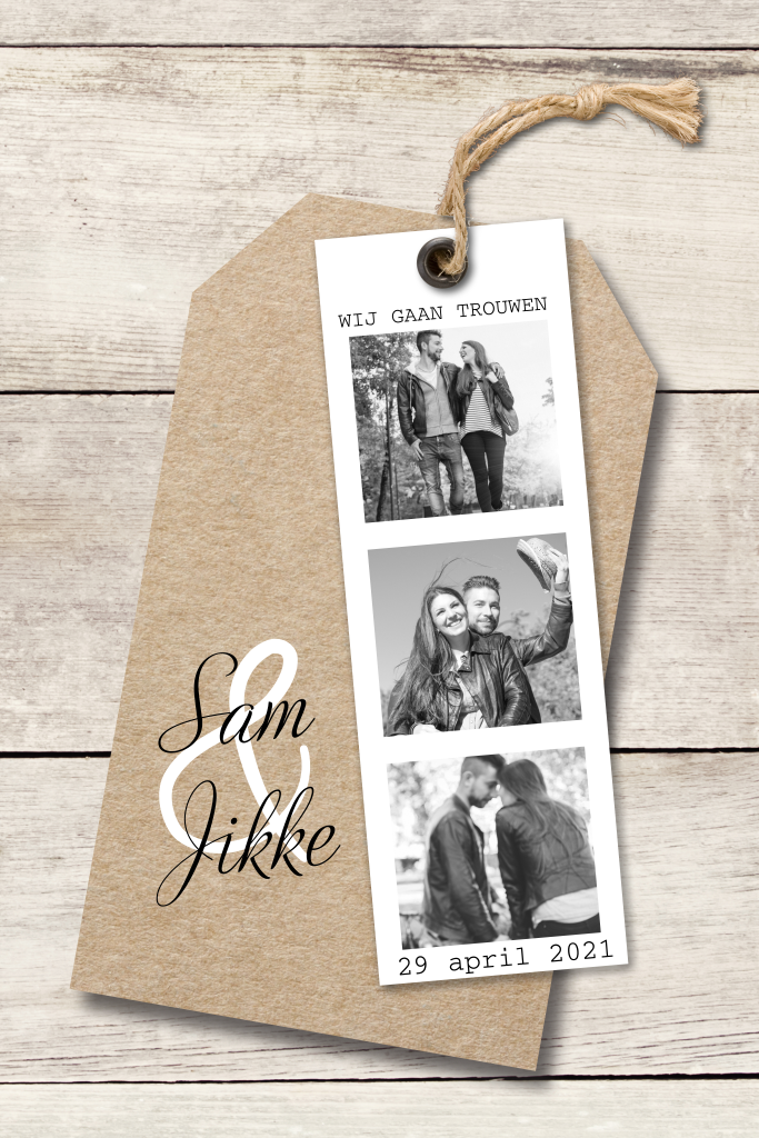 Een hippe, enkele trouwkaart met een houtachtergrond en een label van kraft: wat stoer! Ook tof is de fotostrip aan het label. Heb jij 3 leuke foto's van jullie samen? Zet ze hier in en maak hier een persoonlijke trouwkaart van!