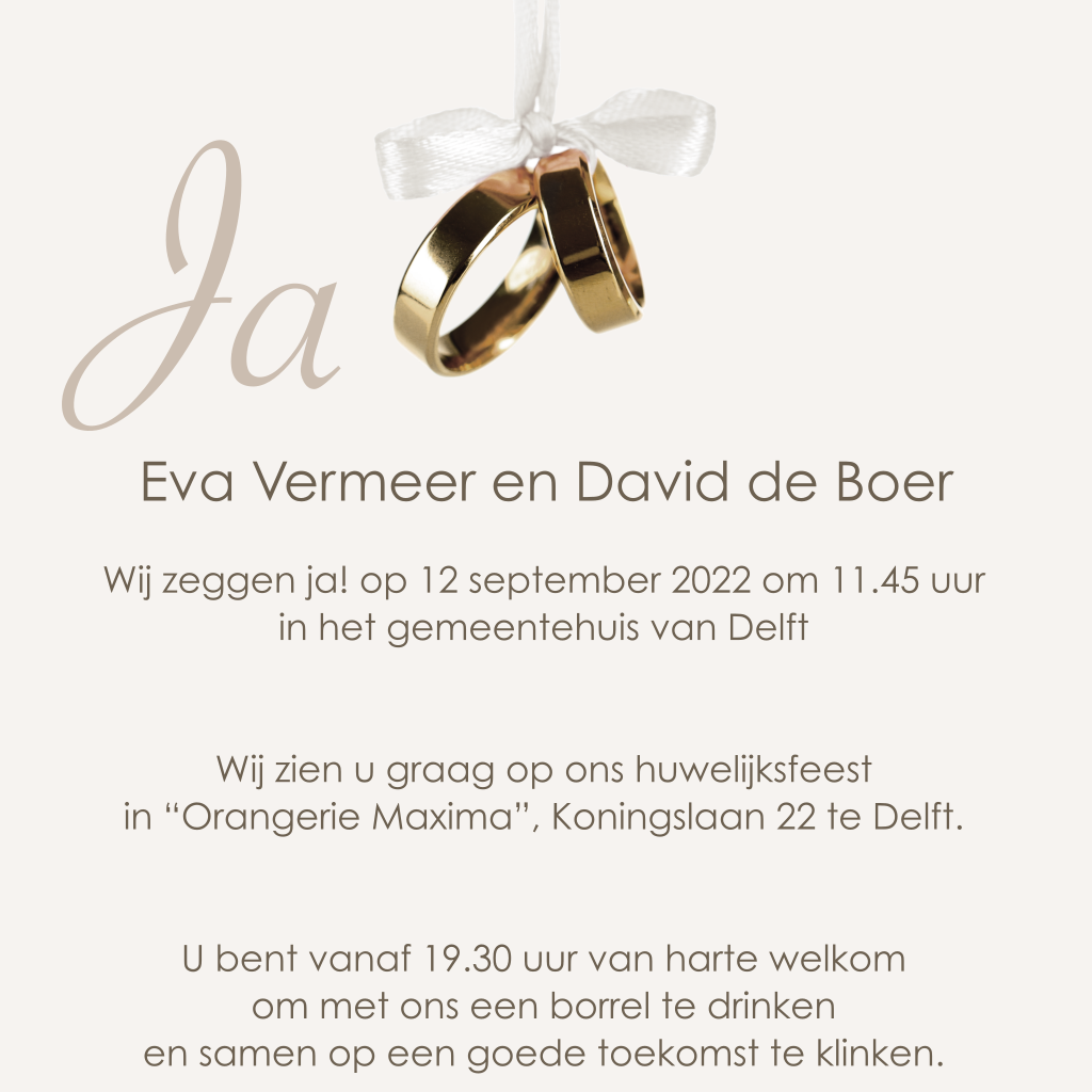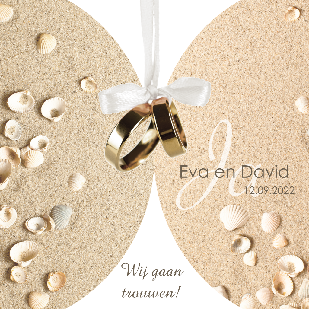 Vierkante trouwkaart helemaal in strandthema! Origineel is de scheiding die in het midden is gemaakt en de goudkleurige ringen aan een wit lint. Speel met de lettertypes en kleuren en maak er helemaal je eigen kaartje van!