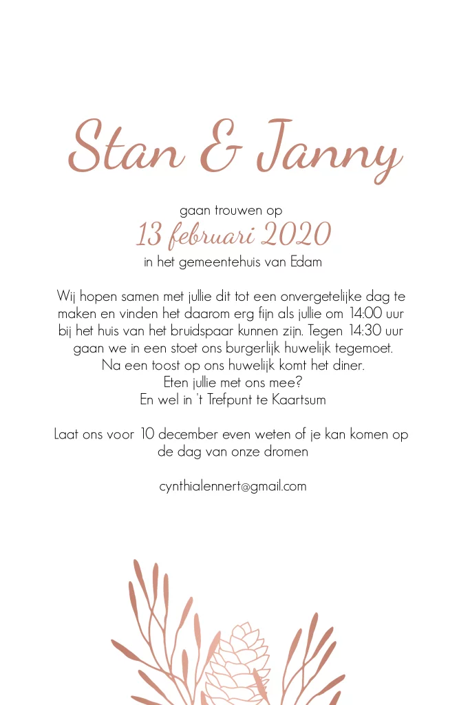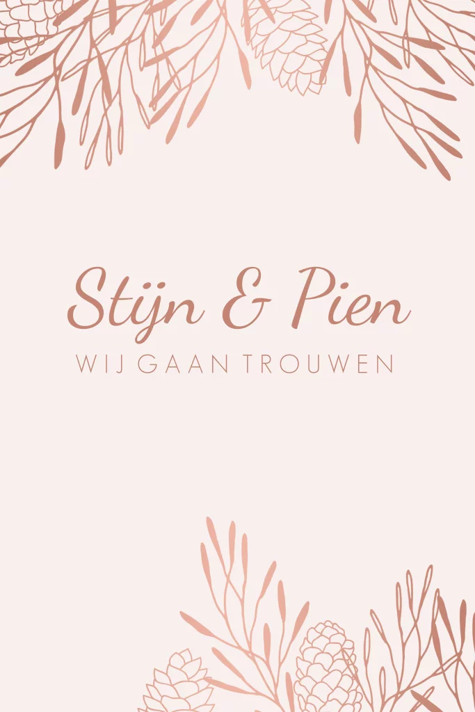 Wat een stijlvolle trouwkaart met fijn getekende takjes in koperkleur! Deze kaart heeft een rustige, maar ook chique uitstraling. Teksten en lettertypes zijn naar wens aan te passen. Iets voor jullie?