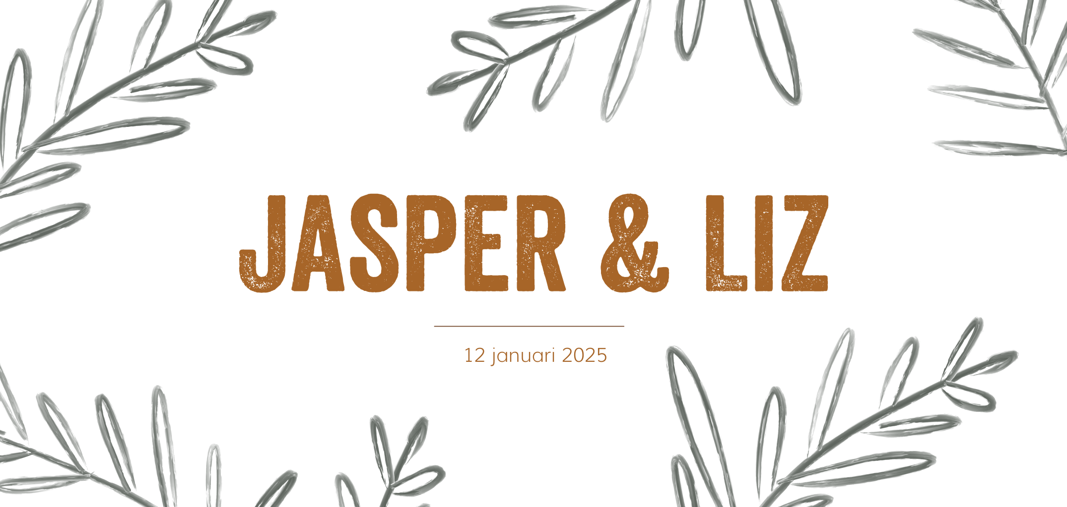 Hippe trouwkaart met zwarte lijntekeningen van takjes en jullie namen in een stoer lettertype. Je kan deze kaart nog volledig naar wens aanpassen in de online editor. Dus toch liever een ander lettertype of andere kleuren? Dat kan heel gemakkelijk!
