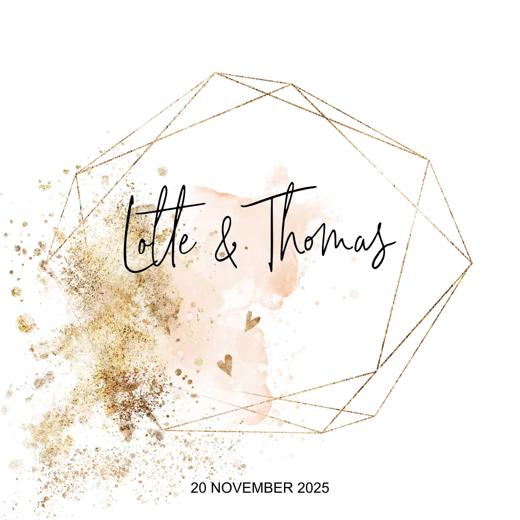 Een trendy trouwkaart met een geometrische vorm, goudkleurige verfspetters, roze aquarel en lieve hartjes! Een stijlvol kaartje die je zelf helemaal afmaakt met je eigen teksten. Ontworpen door LOVZ.