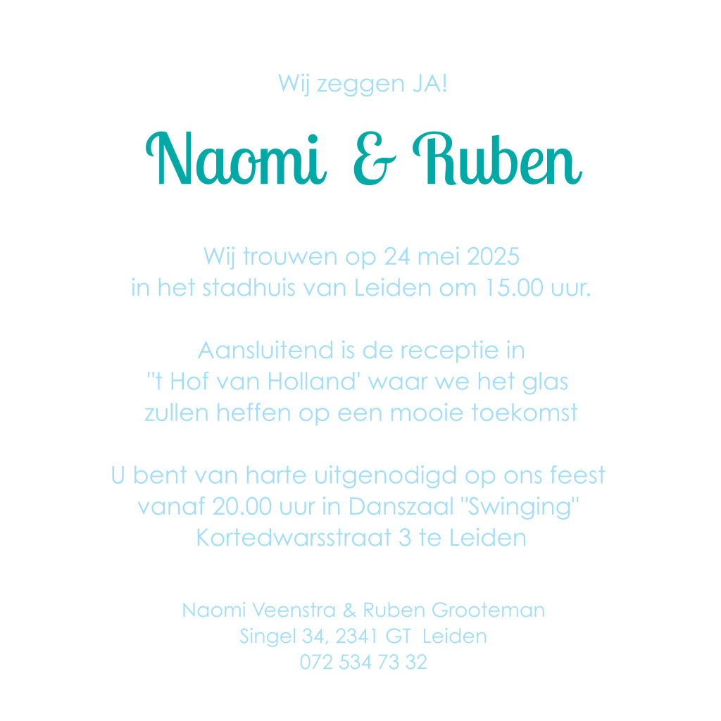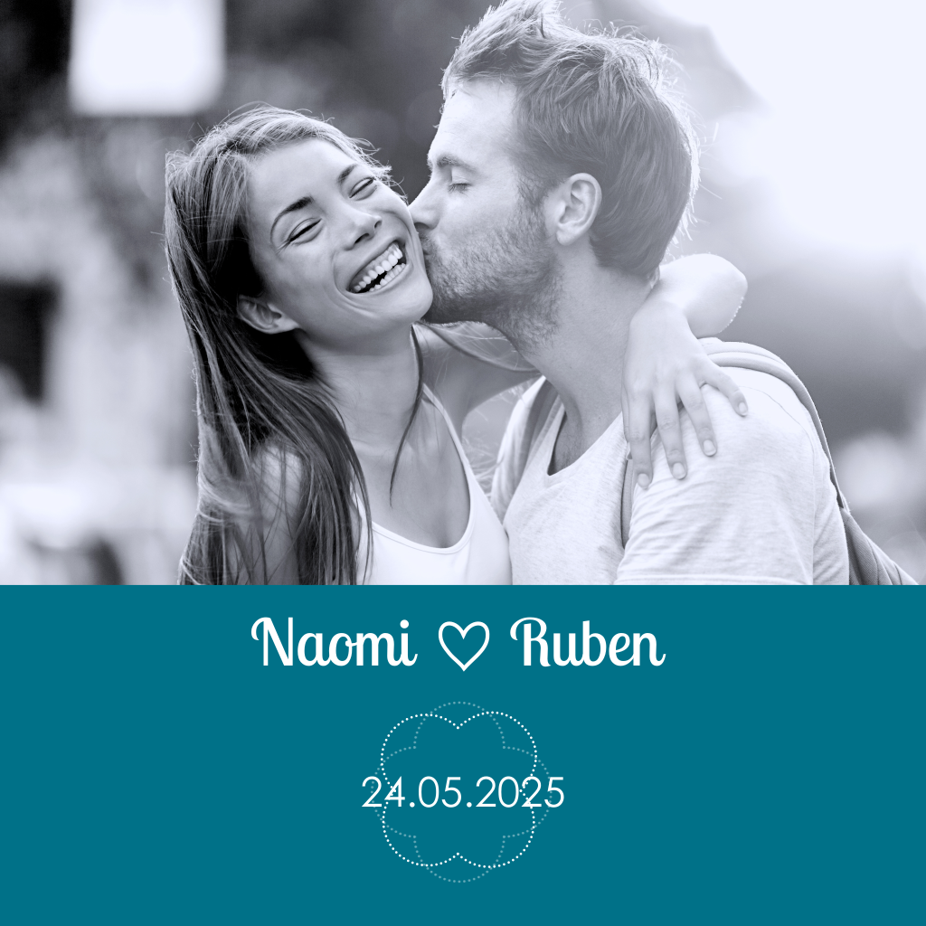 Maak een persoonlijke trouwkaart: voeg een leuke foto toe en kies de kleuren en lettertypes die jij mooi vindt. Leuk aan dit trouwkaartje zijn de met stippellijn getekende figuurtjes. Tip: geef de buitenkant een donkere tint en de binnenkant een lichtere tint, voor een speciaal effect!