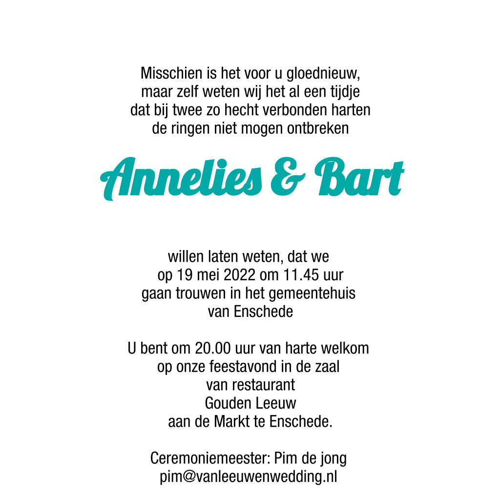 Wie worden de Mr and Mrs? Leuk aan dit stijlvolle vierkante trouwkaartje is dat je op de voorkant een foto van jullie samen toe kunt voegen. Kleuren kun je zelf kiezen en aanpassen!