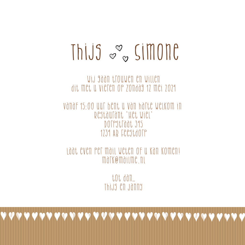 Leuke trouwkaart met de illustratie van een stel. De witte hartjes zijn op een originele kraft achtergrond.