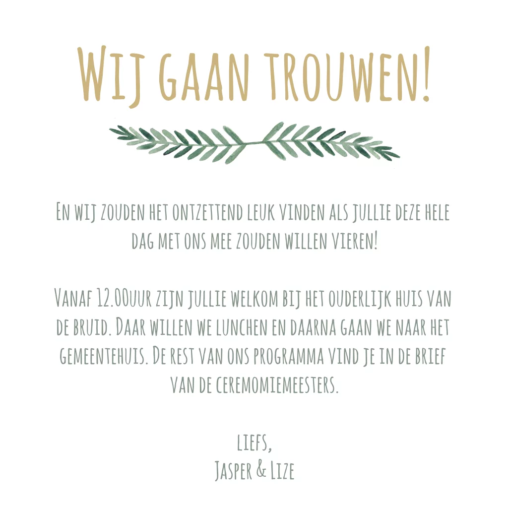Takjes en roze bloemen van watercolour op je trouwkaart: wat vrolijk! Deze boho kaart heeft tekst in een bijpassende kleur. Maak hier jullie eigen kaartje van!