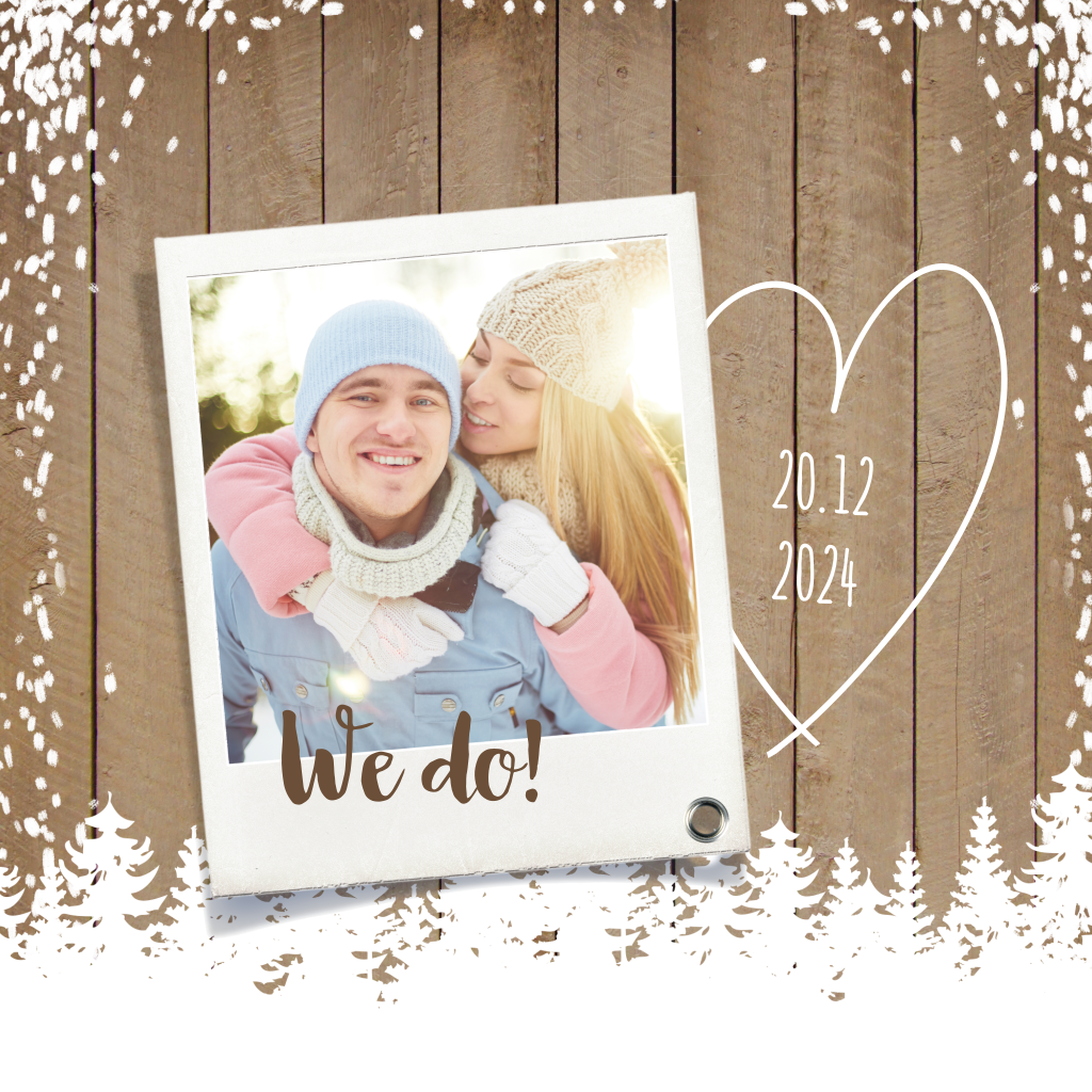 Wanneer jullie trouwen in de winter is het leuk om te werken met dit thema. Een stoere houtlook, sneeuw, dennenbomen en een polaroid waarin je jullie foto kunt plaatsen: superleuk! Iets voor jullie, dit hippe en knusse trouwkaartje?