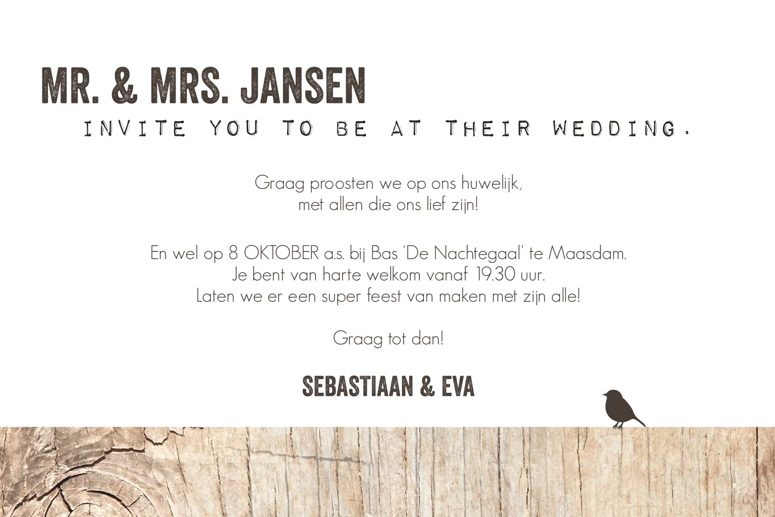 Zijn jullie opzoek naar een bruiloftsuitnodiging die echt stoer is? Dan is deze kaart wat voor jullie! Met een hippe illustratie van een boom met bladeren in hartjes vorm op een houten achtergrond. Plaats op de voorkant van de trouwkaart een mooie foto van jullie als aanstaand bruidspaar. Kies als papiersoort oud-hollands, dat geeft een mooie structuur aan het hout.