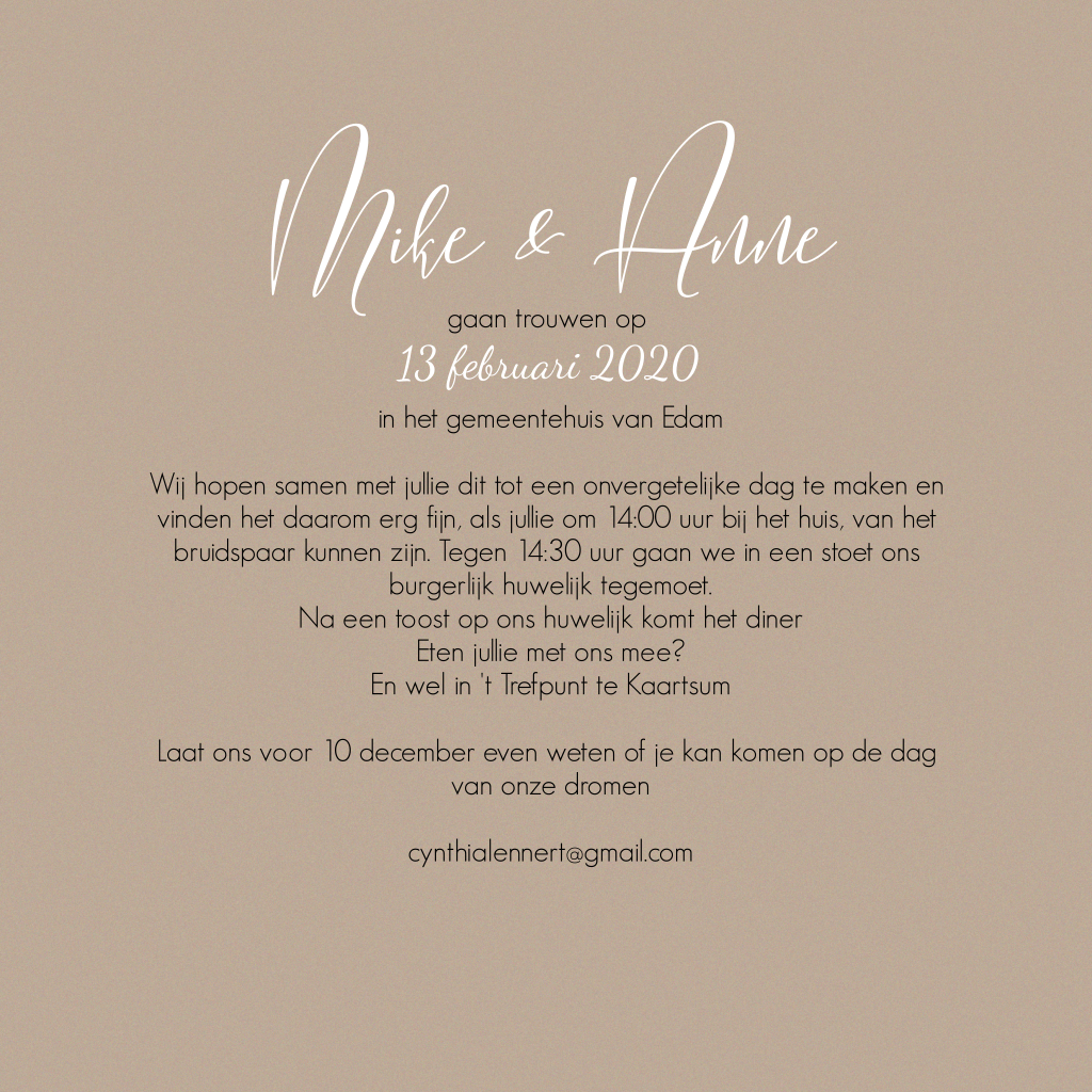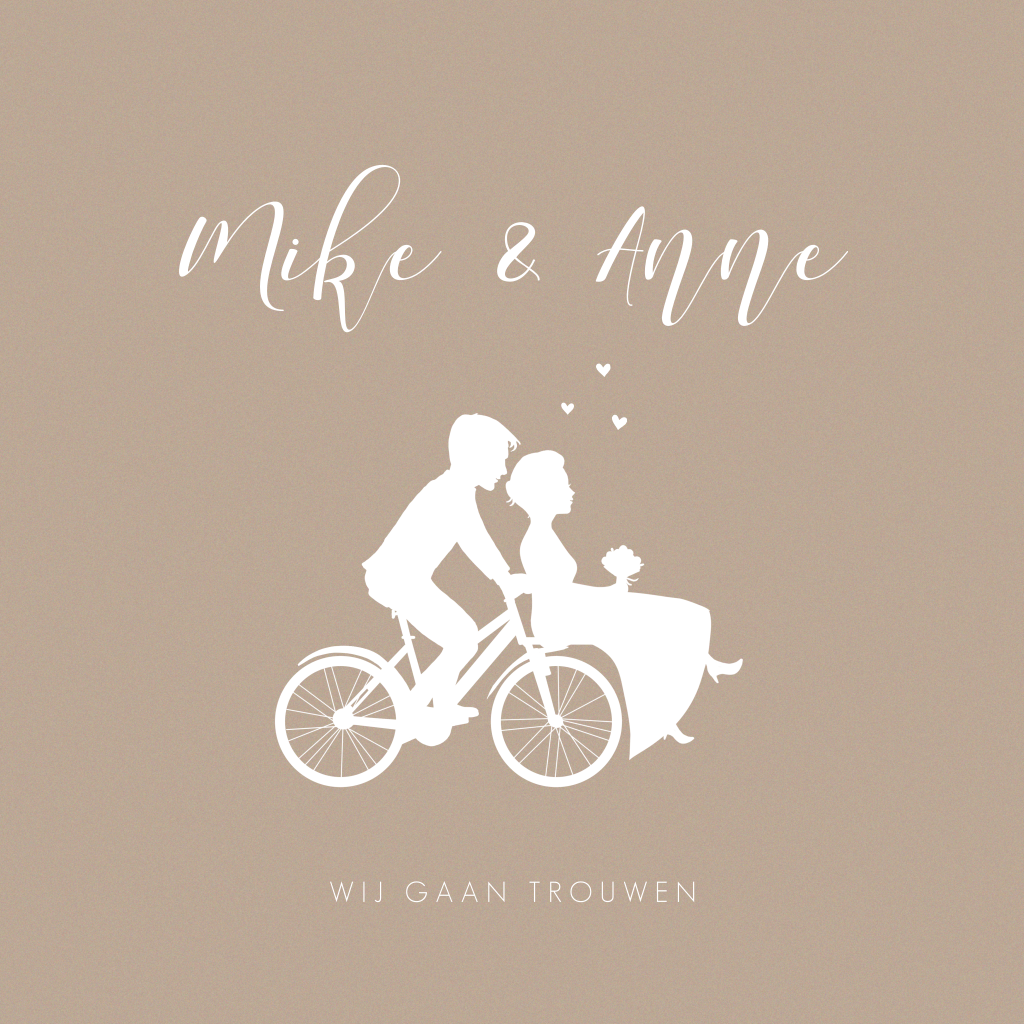 Vrolijke trouwkaart in kraftlook achtergrond met een bruidspaar op fiets in silhouet.