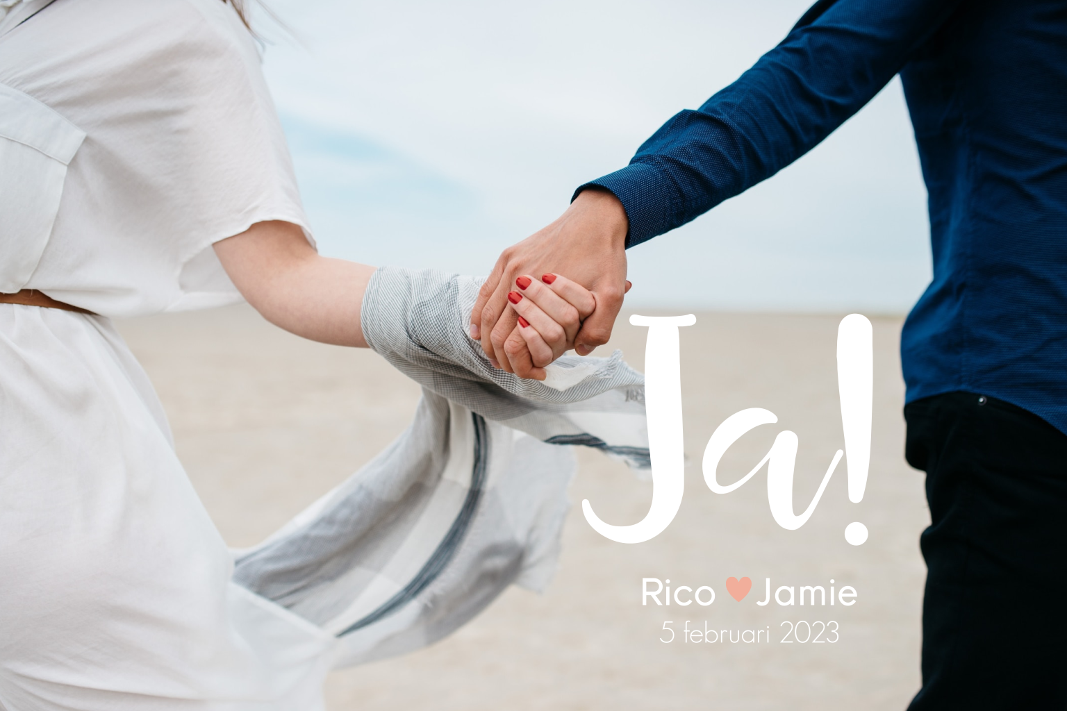 Deze prachtige trouwkaart heeft ruimte voor een grote foto op de voorkant. De handgeschreven typografie geeft het kaartje een speelse twist. De roze hartjes komen op verschillende plekken terug. Pas het kaartje helemaal naar wens aan.