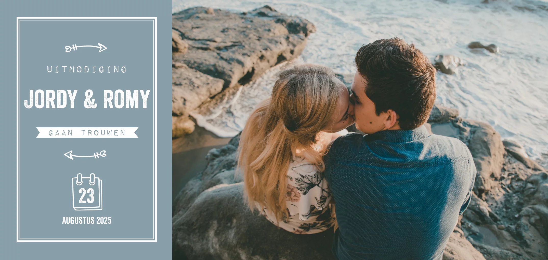 Deze trouwkaart heeft ruimte voor een grote foto, die je zelf kunt uploaden. De kleuren en het lettertype zijn stoer maar kun je eventueel zelf wijzigen.