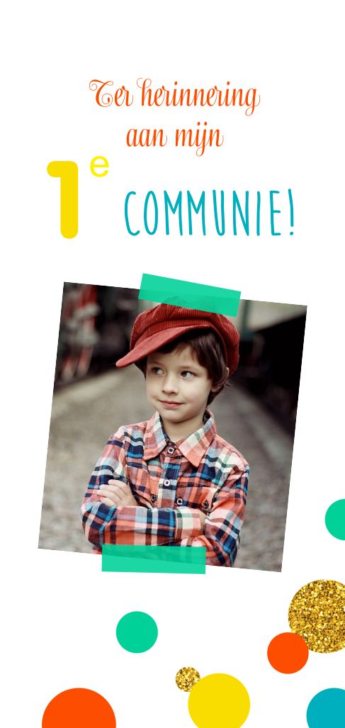 Bedankkaart voor de communie met kleurrijke confetti en foto