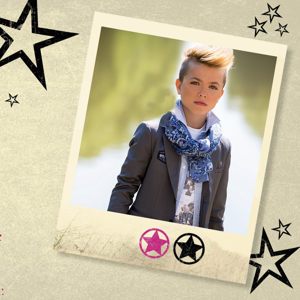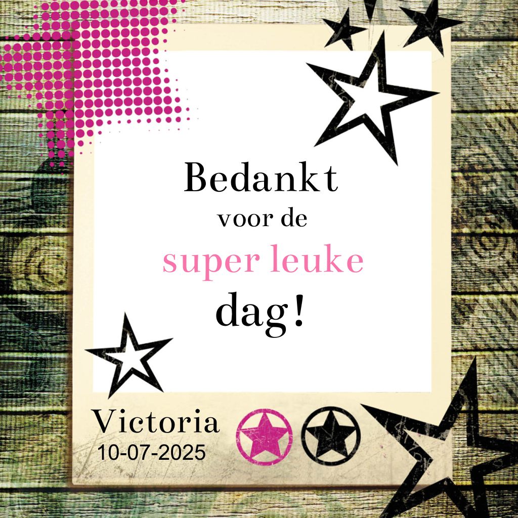 De houten achtergrond en de grote sterren maken dit een stoere kaart. Door de foto en de persoonlijke tekst wordt het een uniek ontwerp.