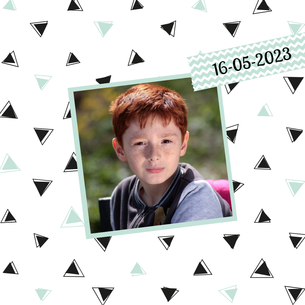 Wat een hippe bedankkaart voor een jongen! De foto neemt plaats op een achtergrondpatroon van driehoekjes. De kleuren en lettertypes zijn naar wens aan te passen!