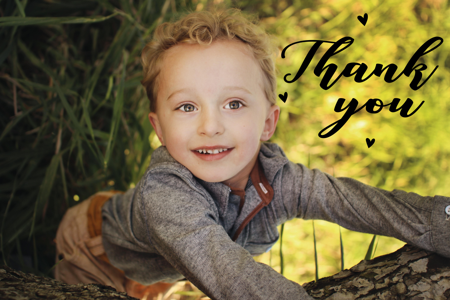 Maak deze hippe bedankkaart voor een communie compleet met je eigen foto. Over de foto heen staan de tekst 'thank you' in sierlijke letters en hartjes. Pas de teksten en kleuren op de kaart aan en maak zo je eigen unieke ontwerp.