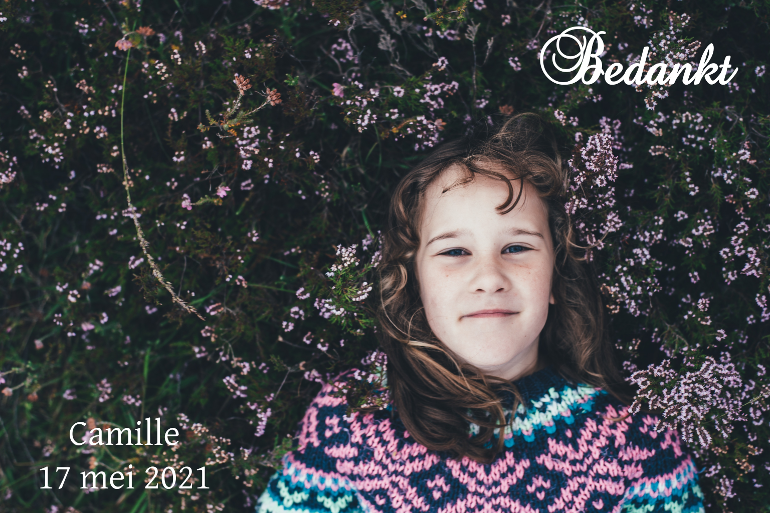 Een romantische communie bedankkaart voor een meisje met een foto op de voorkant en tekst in een sierlijk lettertype. Schrijf jouw eigen tekst in de online editor.