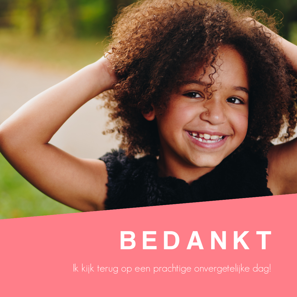 Lieve, minimalistische communie bedankkaart voor een meisje met een foto op een roze achtergrond. Voeg jouw eigen tekst en foto toe in de online editor.